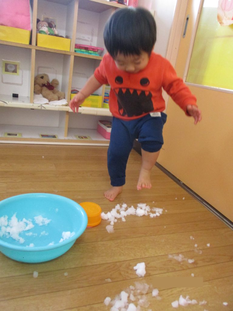 初めて雪と触れ合う0歳児さん。雪に対して恐怖心や嫌悪感を抱かないよう、お部屋で雪に触れることから始めてみました。