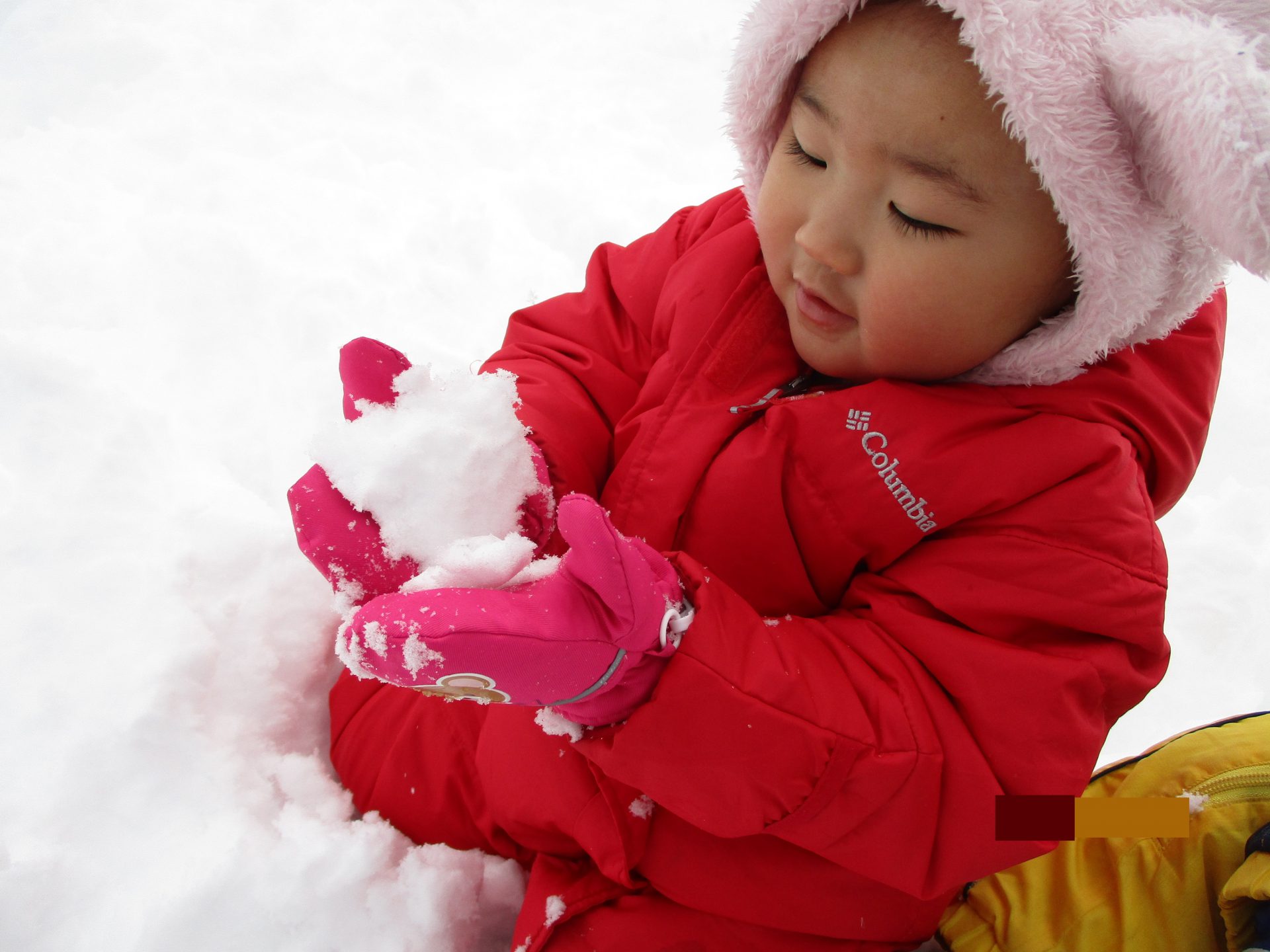 保育士の真似をしながら、雪を投げたり、握ったり。