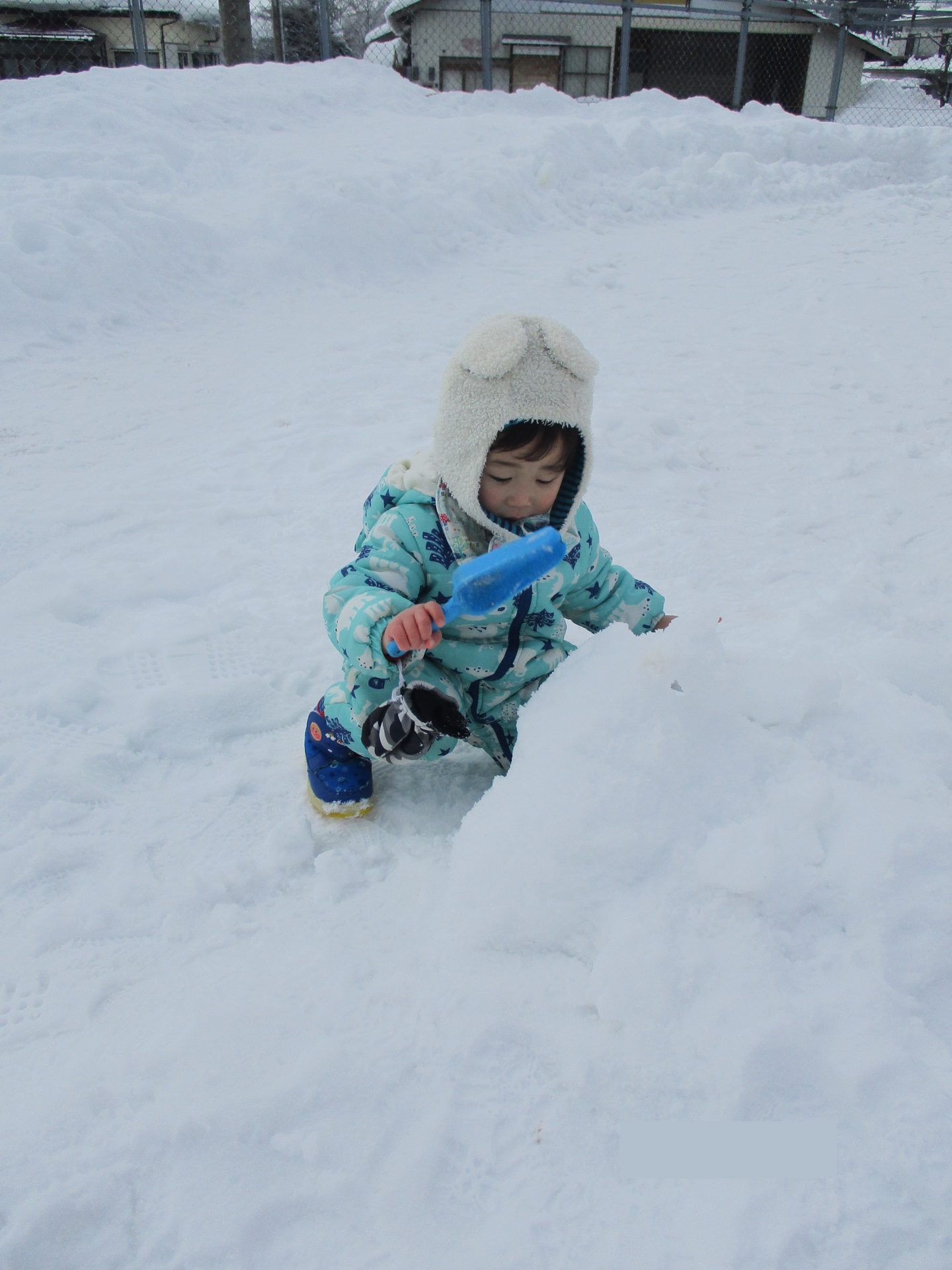雪に慣れている1歳児さんは、手だけでなく足もつかってダイナミックに!