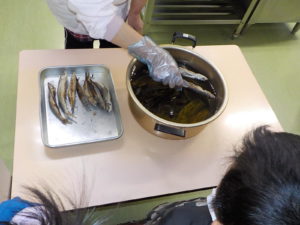 これは前日に仕込んだ出汁です。お水の中に焼いたトビウオと昆布を入れて一晩ねかせました。岡井さんのそばつゆも絶品です。子どもたちも興味津々でした。