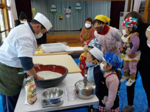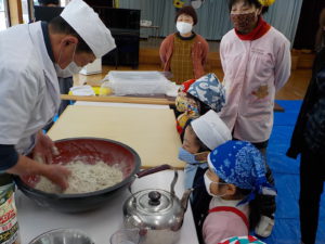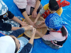 そば粉に水を入れて練っていくと色が変わりました。気づいた子どもたち。「緑色になった!。」匂いにも気づきました。「そばのいい匂いがする。」「おいしそうだな。」