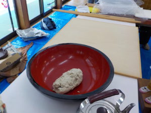練っている途中でそば粉がボロボロして手にくっつきます。どうやったら柔らかくしっとりするかな。水を入れながら調整していきます。