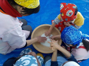 そば粉に触らせてもらい「さらさらする。」手触りの気持ちよさをしっかり味わっていました。