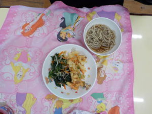おそばが完成しました。今日の給食はあたたかいつゆをかけた打ちたてのかけそばとかき揚げ、磯和えです。