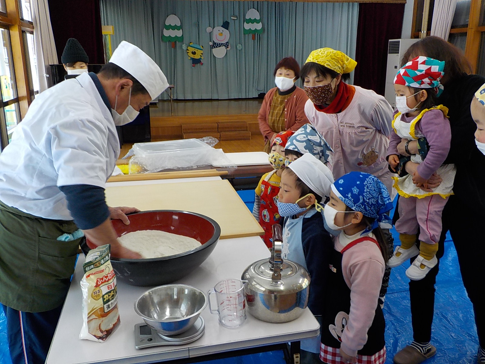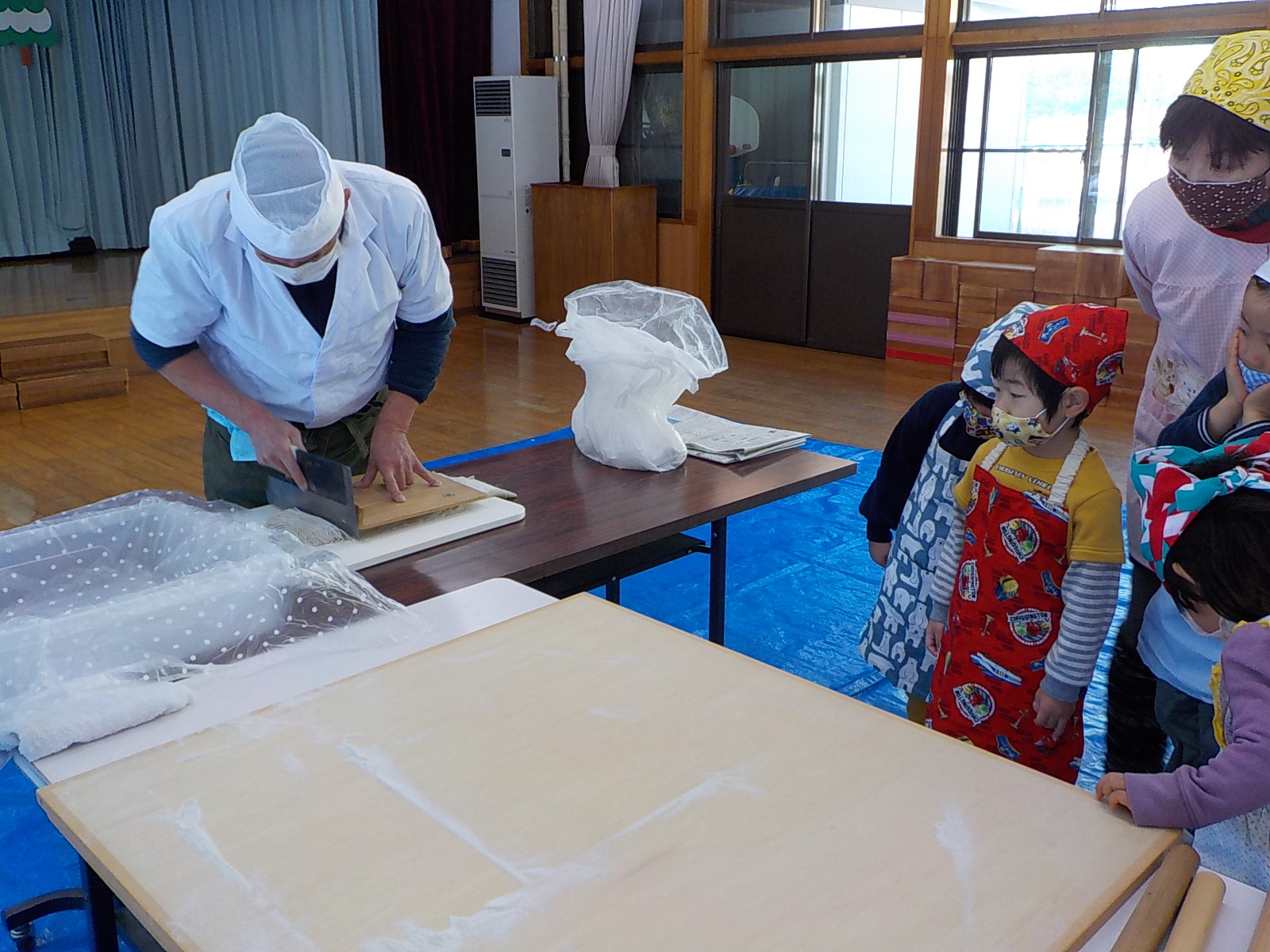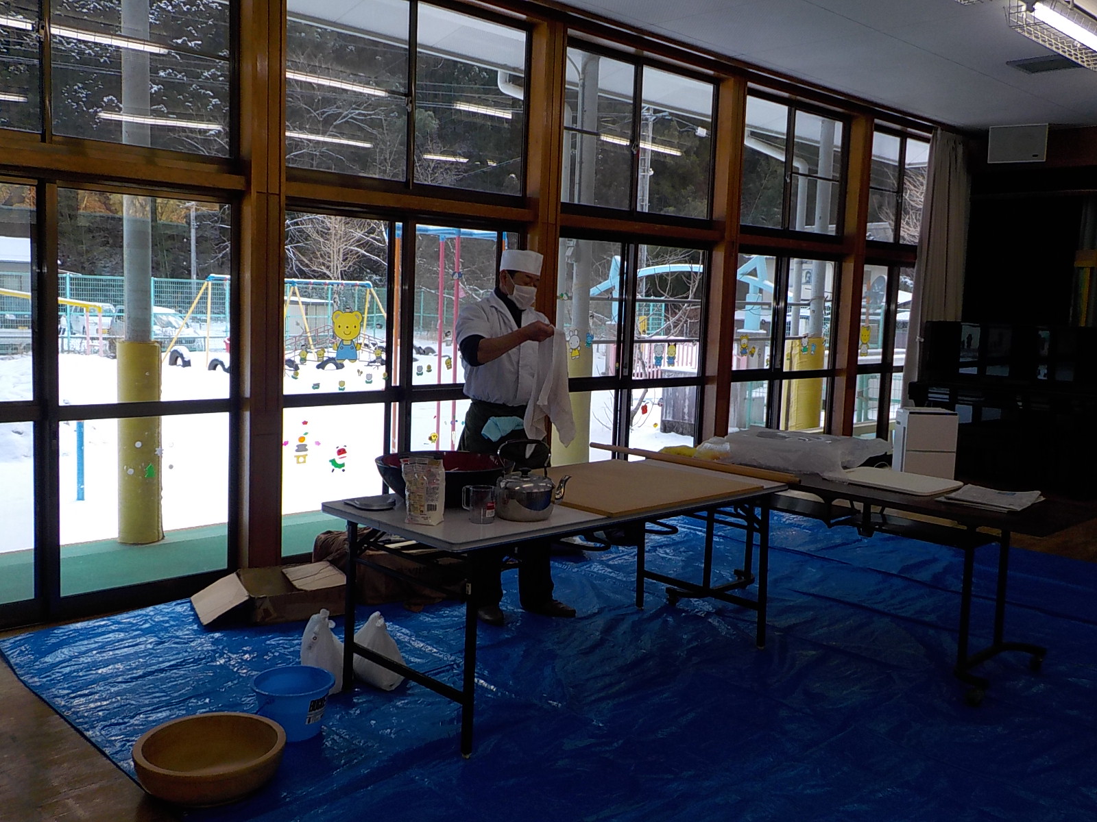 ・昨年8月のそばの種まきから始まり、刈り取り、はざかけ、脱穀までを子どもたちに教えてくださった地域のそば名人岡井さん。製粉も岡井さんがしてくれました。そばの種がこうして食べられるまでになる過程をみることはなかなかできませんが、上村の伝統食を子どもたちに伝えたいという思いに頭が下がります。本物のそばの味や色。本物のそばのつゆ。子どものころにどれだけの本物に出会うでしょうか。これが本当のそばの風味、そばの味だということを岡井さんは伝えたいのだと思います。色、感触、匂い、などの五感を働かせてじっくりと美味しくいただくことの大切さに気付かされました。