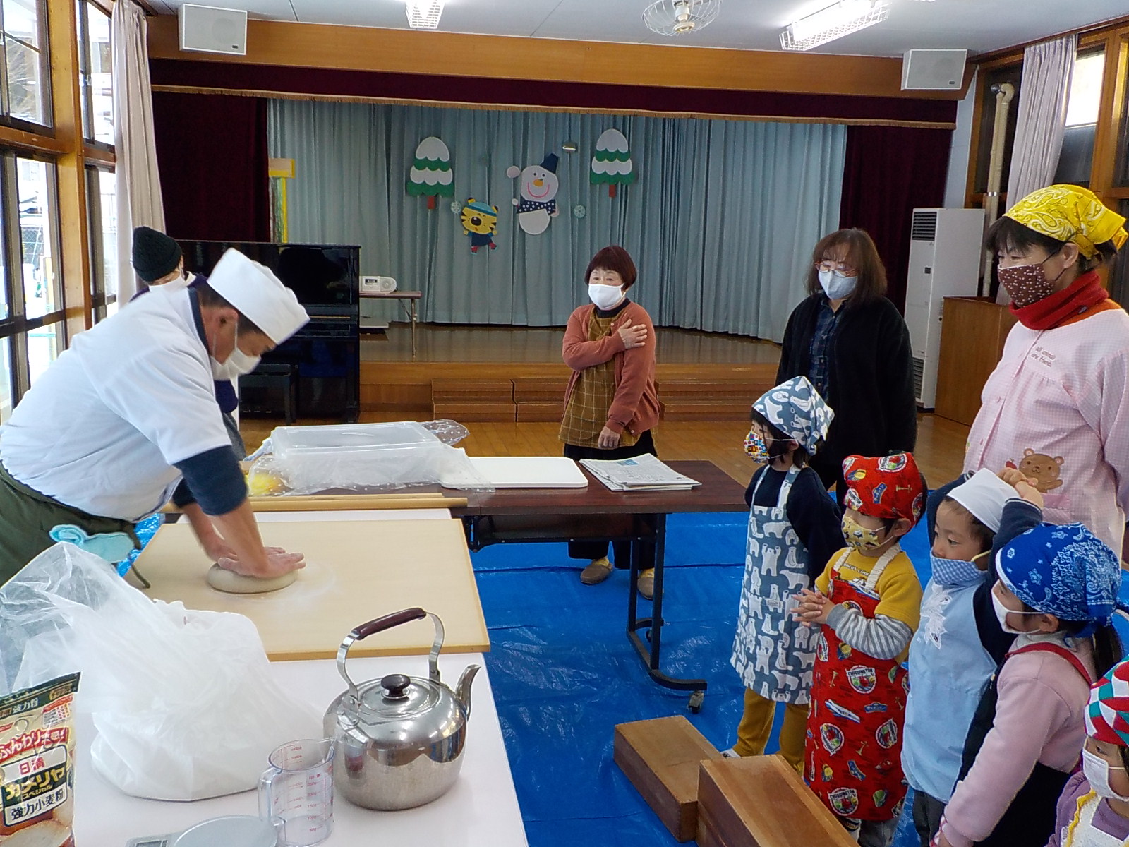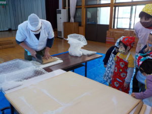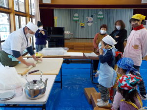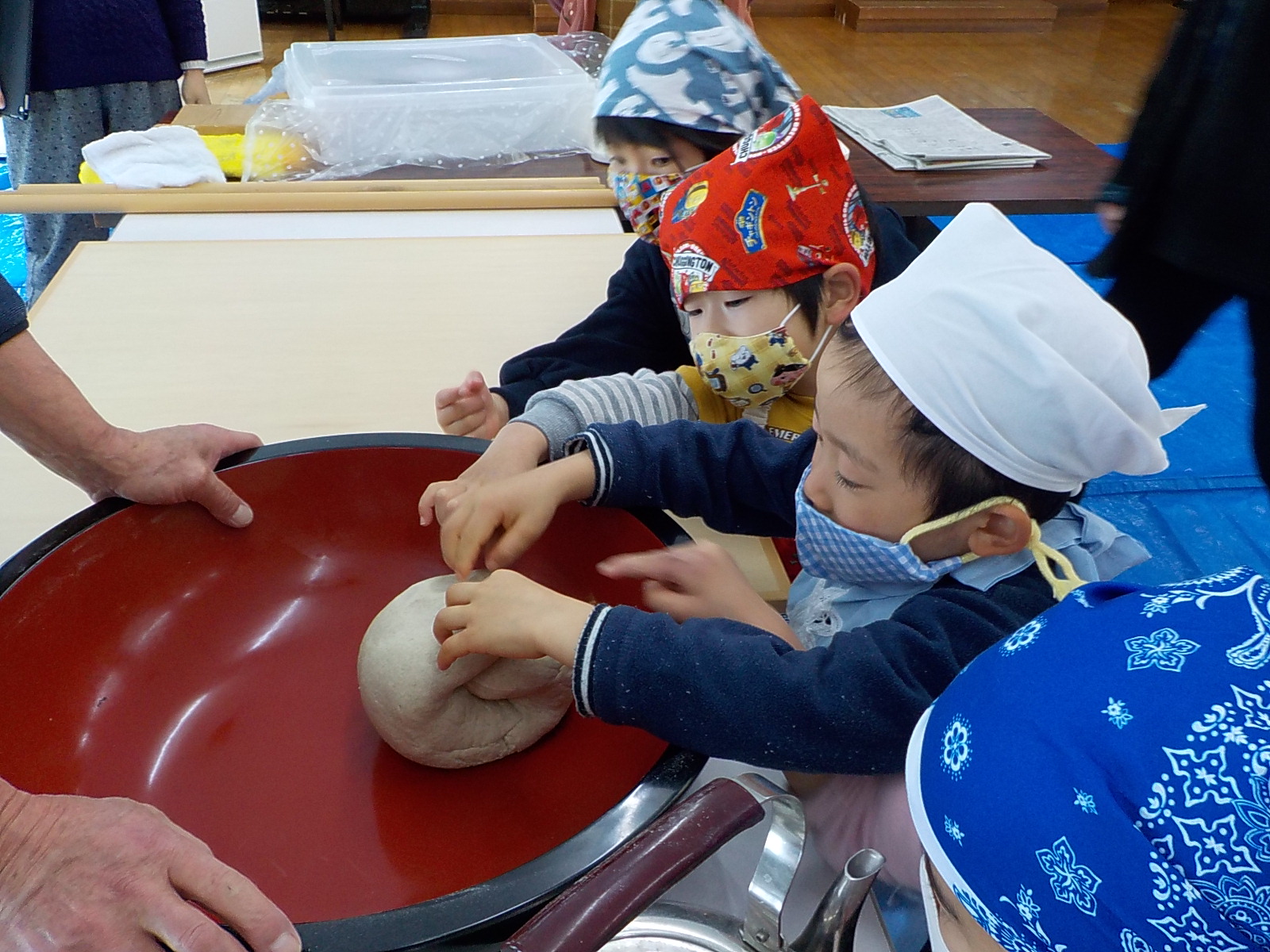 そば粉に水を入れて練っていくと色が変わりました。気づいた子どもたち。「緑色になった!。」匂いにも気づきました。「そばのいい匂いがする。」「おいしそうだな。」