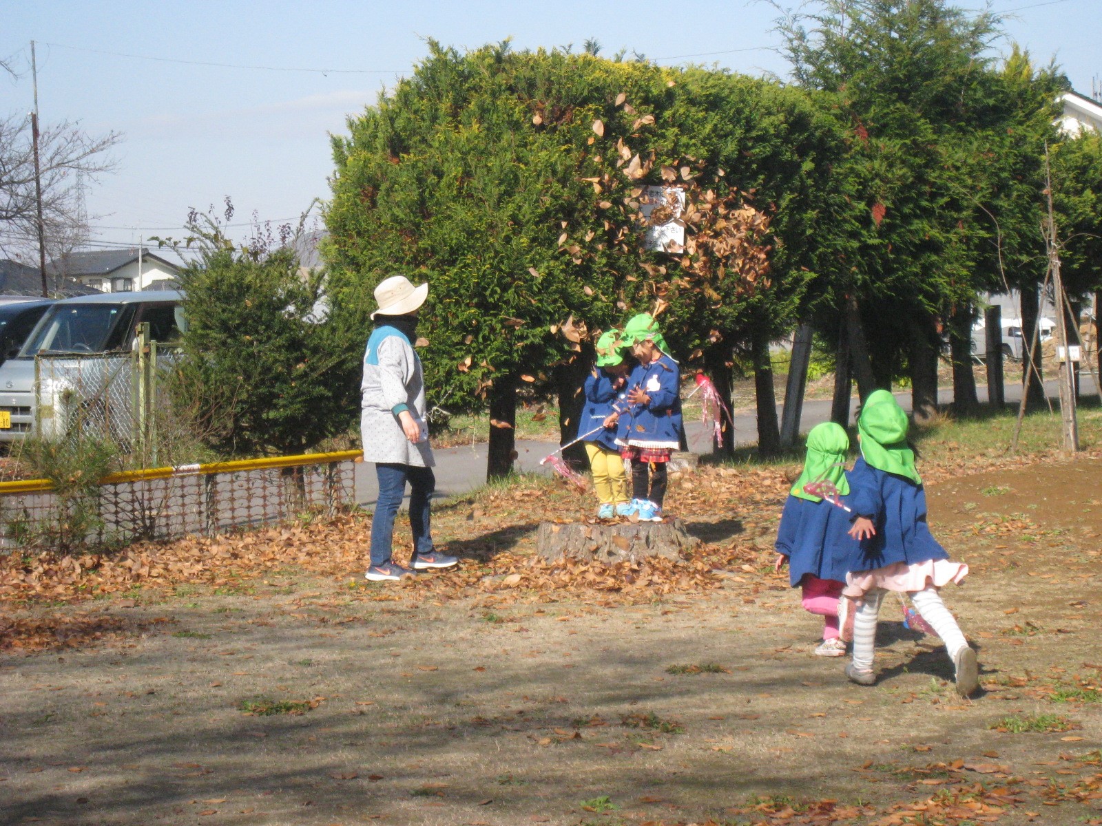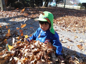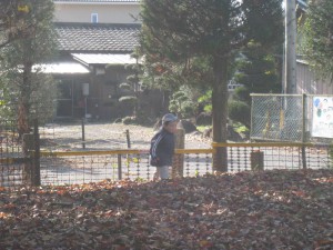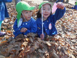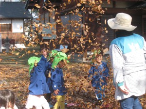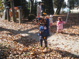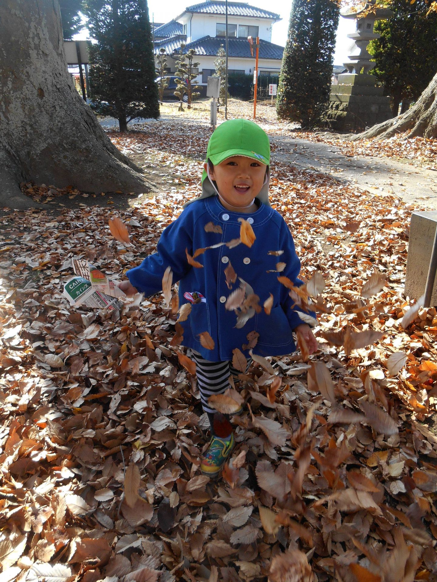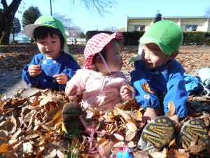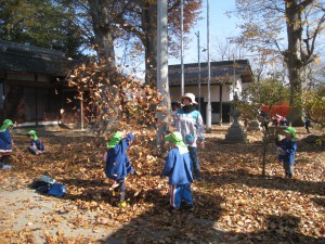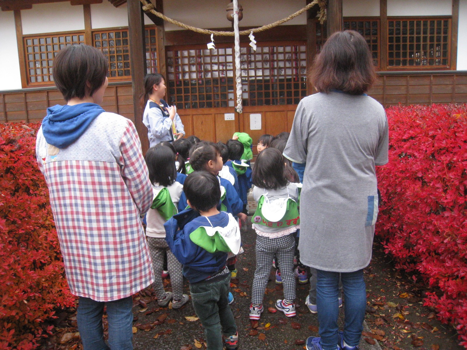 保育園の東隣にある八幡神社は、一年を通し0・1歳クラスから年長クラスの全園児の折に触れての遊び場になっている。園庭では経験できないダイナミックな活動もできる。なかなか遠くまで散歩に行くことができない0.1歳クラスの子ども達にも身近な散歩コースであり、子ども達も大好きな場所である。また 大きいクラスにとっても、朝の活動前の時間や活動後のわずかに空いた時間にも、行って楽しむ事ができる。地域の良さを子ども達と一緒に味わい楽しみ、大切にしていきたい。
