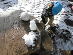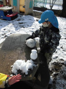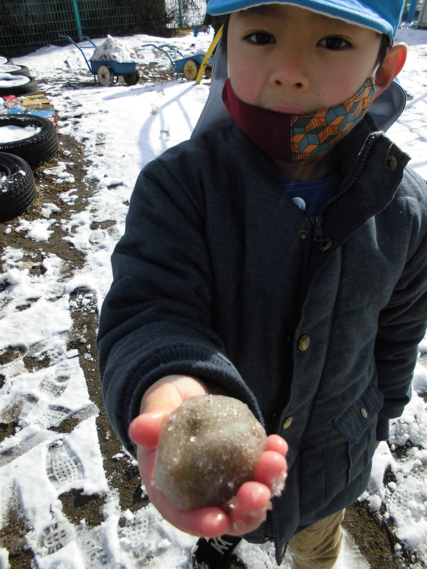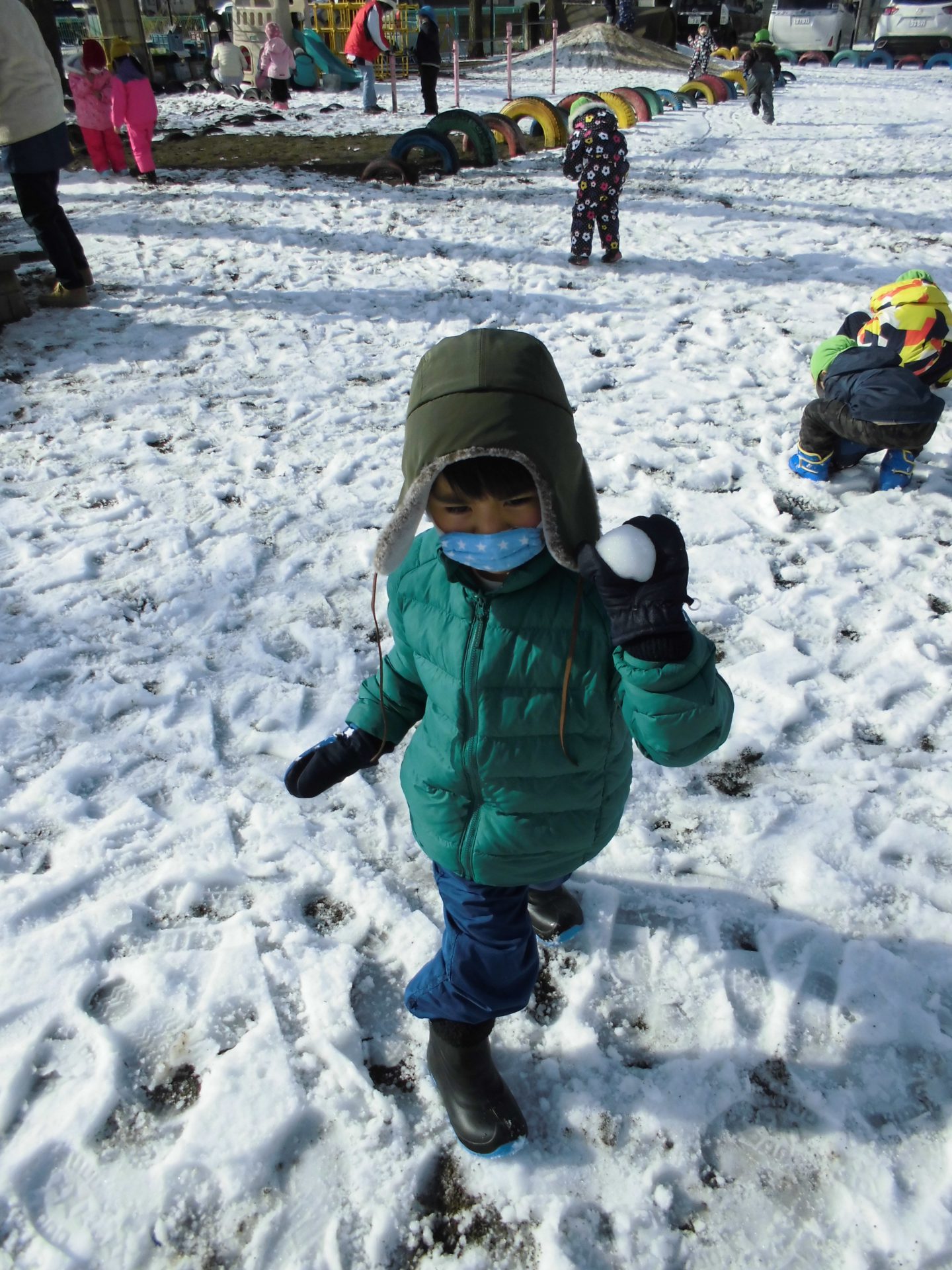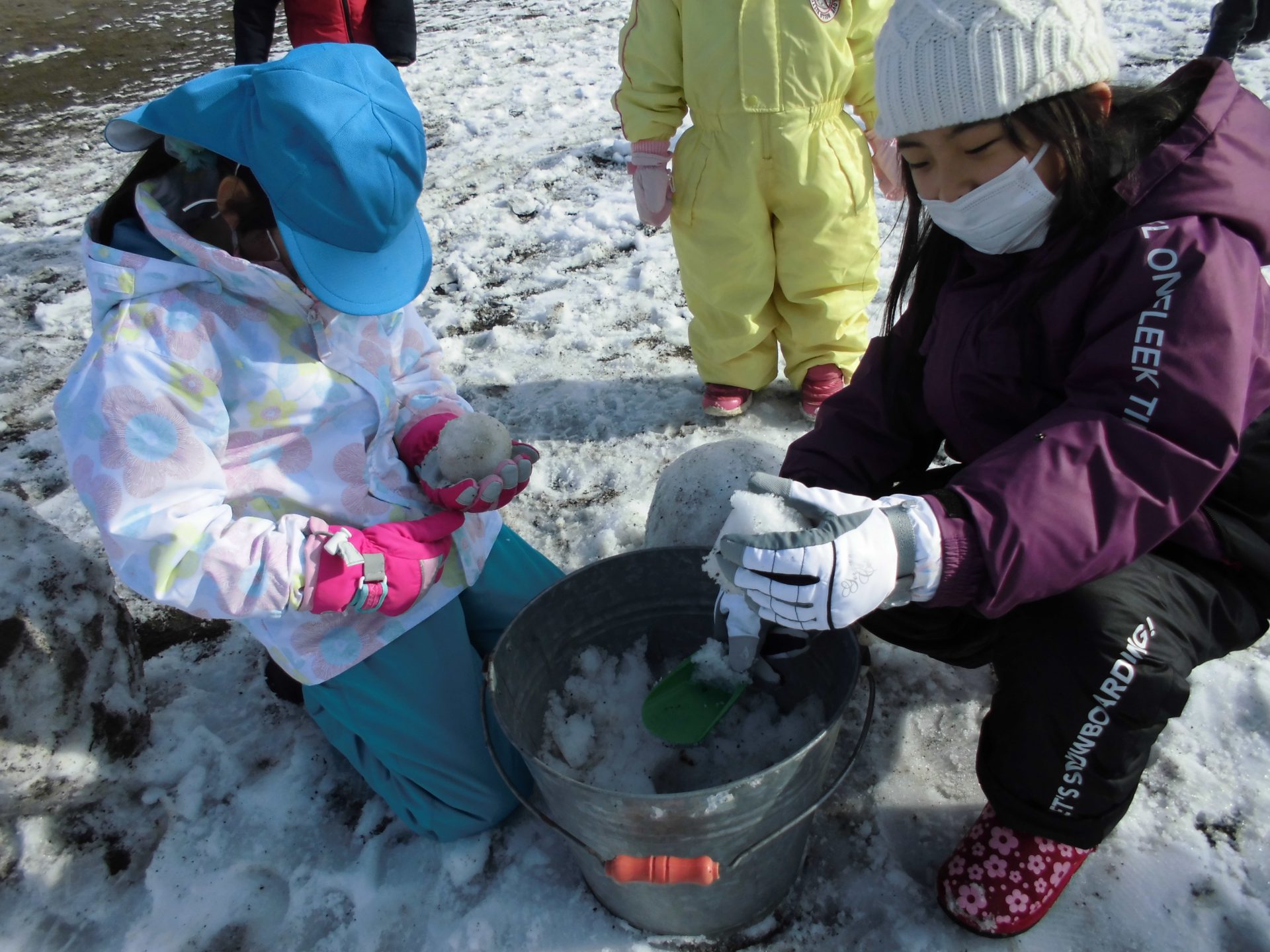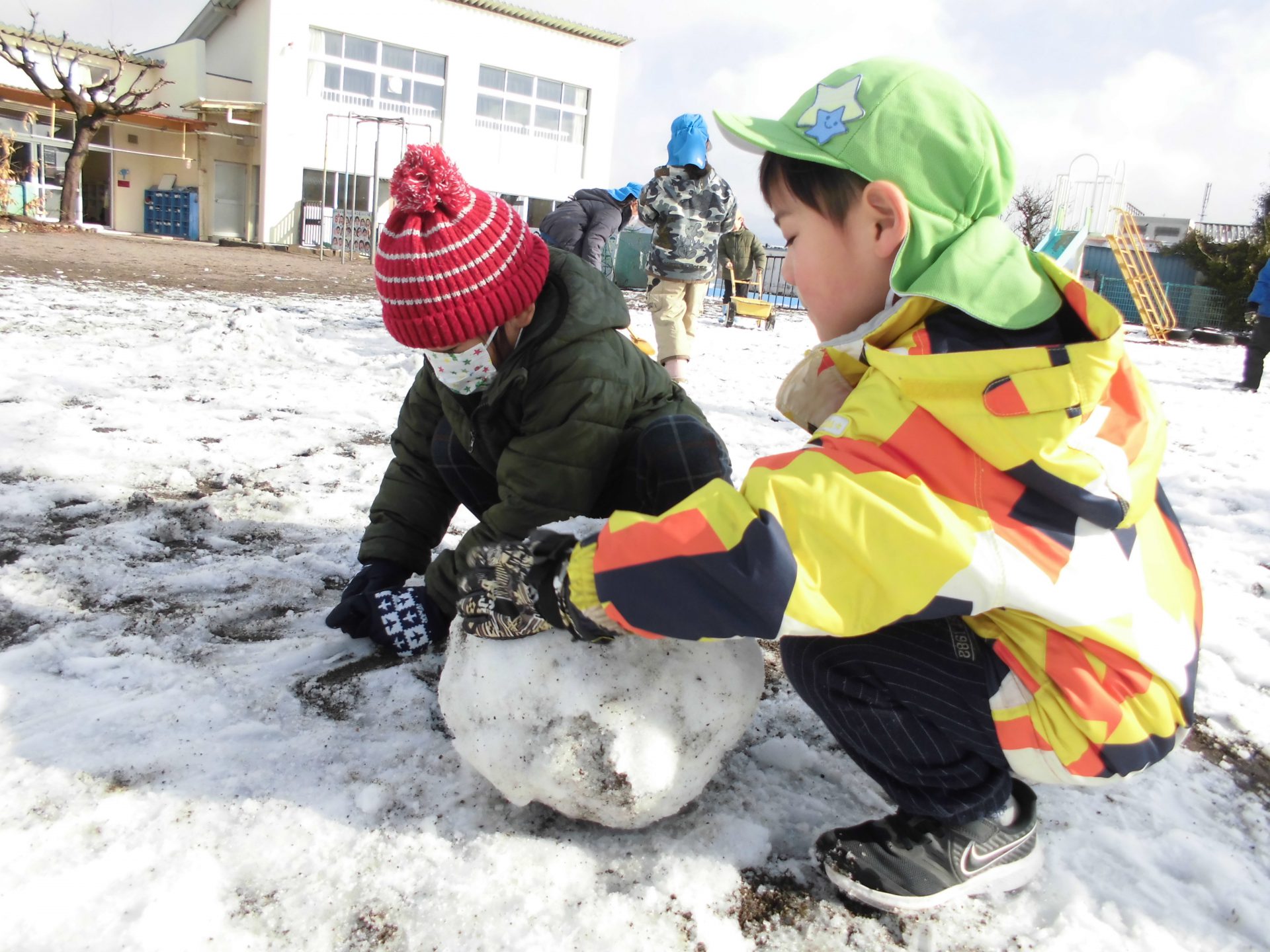 大雪警報のあった翌日、子どもたちが期待していたふかふかの雪ではなかったけれど、久しぶりの雪に朝から大興奮の子どもたち。雪が溶けてしまう前にスノーウェアに着替えて元気いっぱい園庭に飛び出しました!異年齢の友だちと一緒に雪だるま作りをしたり、てんこ盛りの雪をままごとに使ったり、保育士と本気の雪合戦を楽しんだりと貴重な冬ならではの活動を楽しみました。