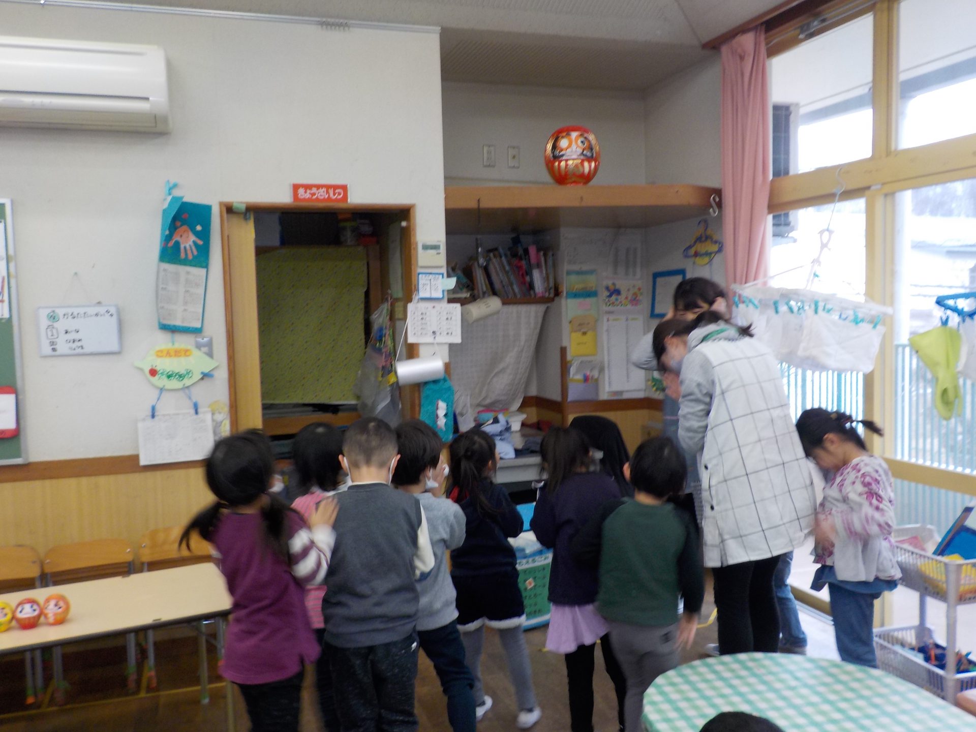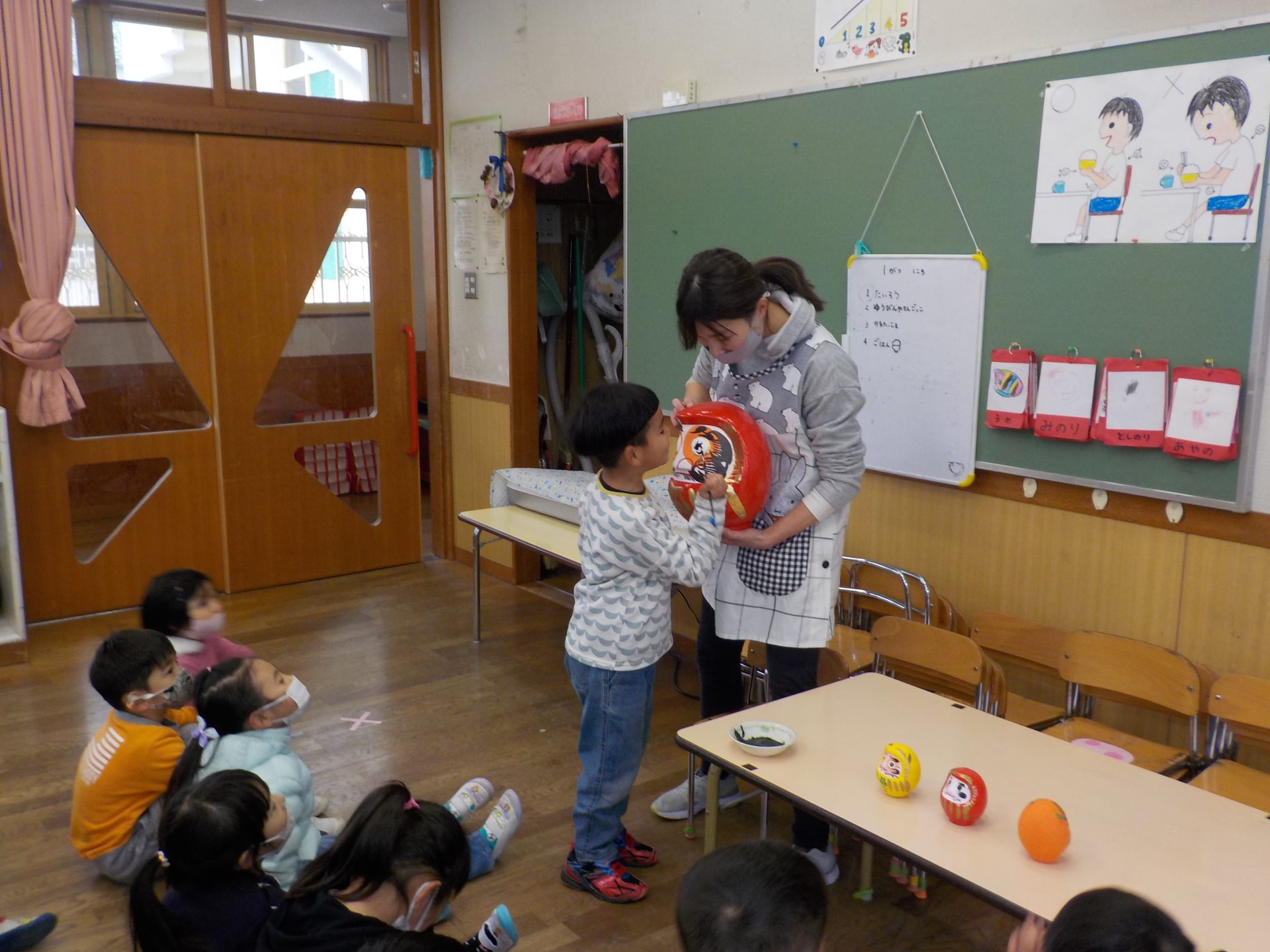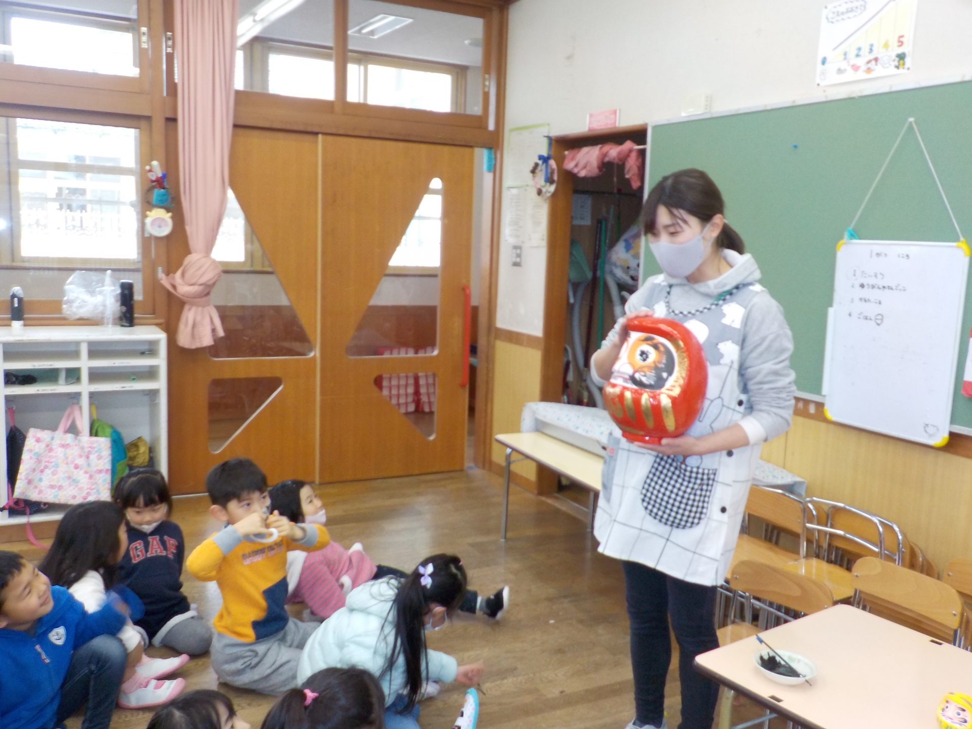 だるまについて、年中児はいろいろな発見や『なんで?』という興味が広がってきました。