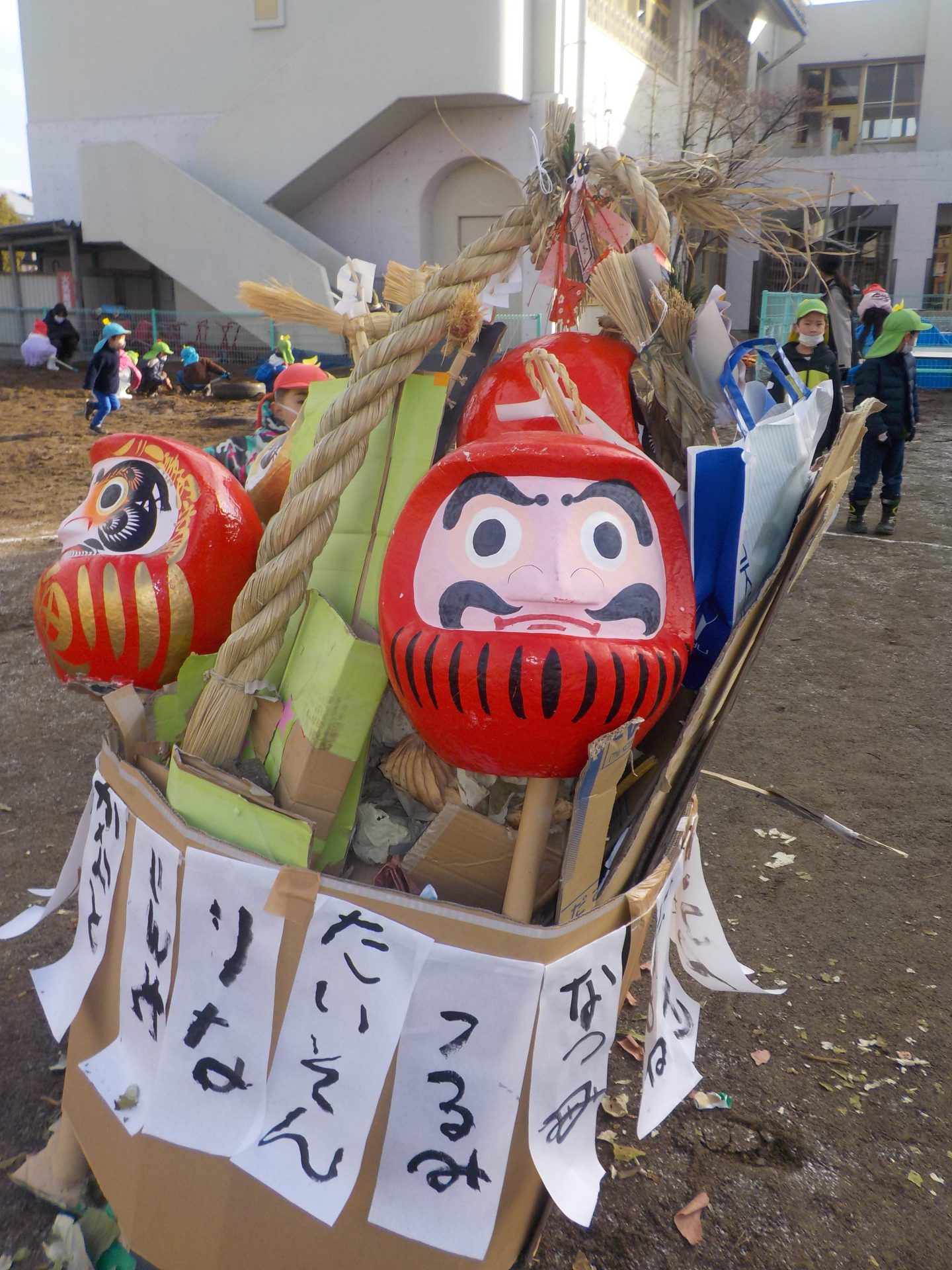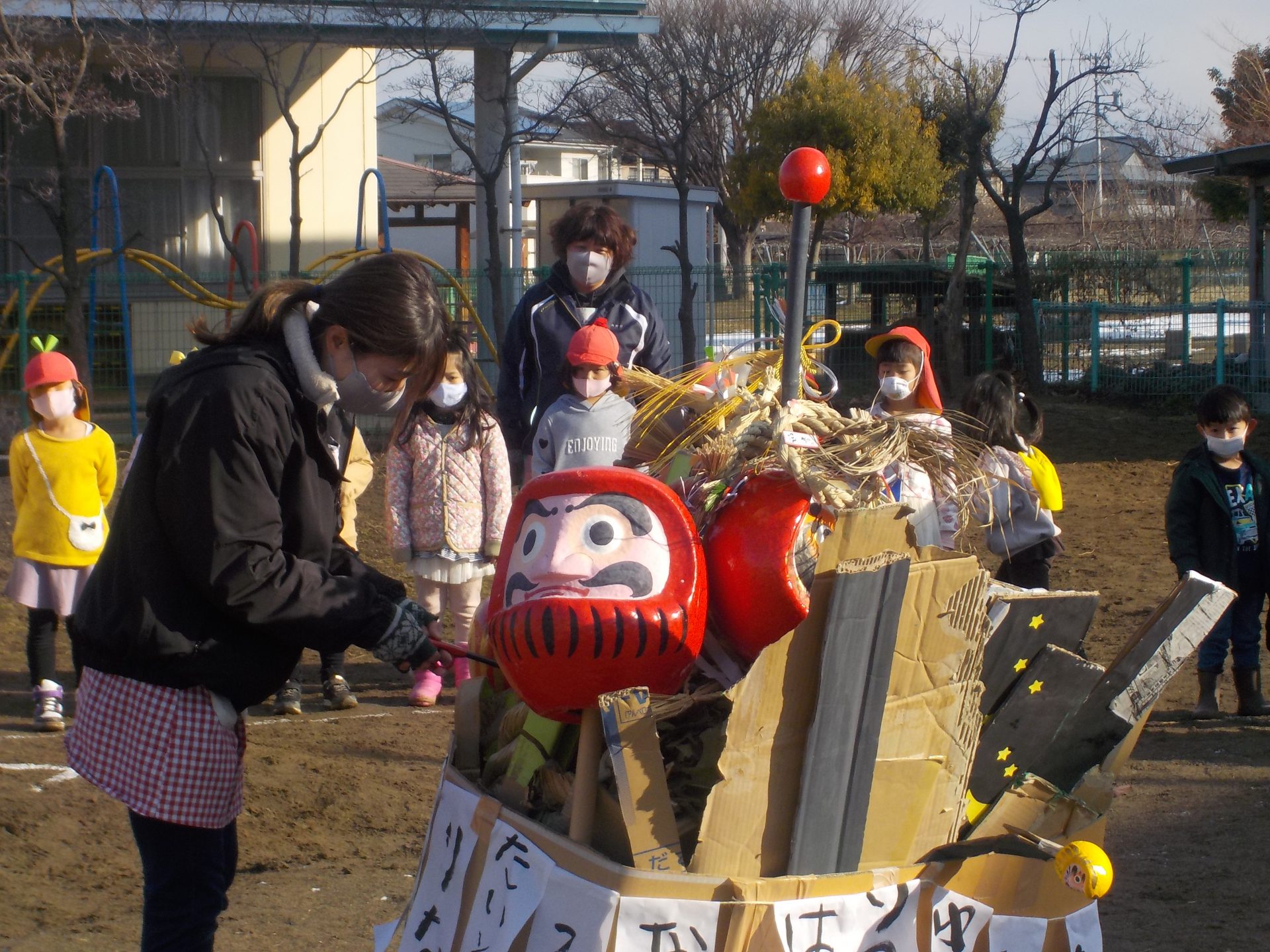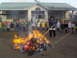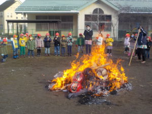 年長さんは、書初めをしたものを入れ、正月飾りやだるま等の縁起物も一緒に入れて火を付けます。