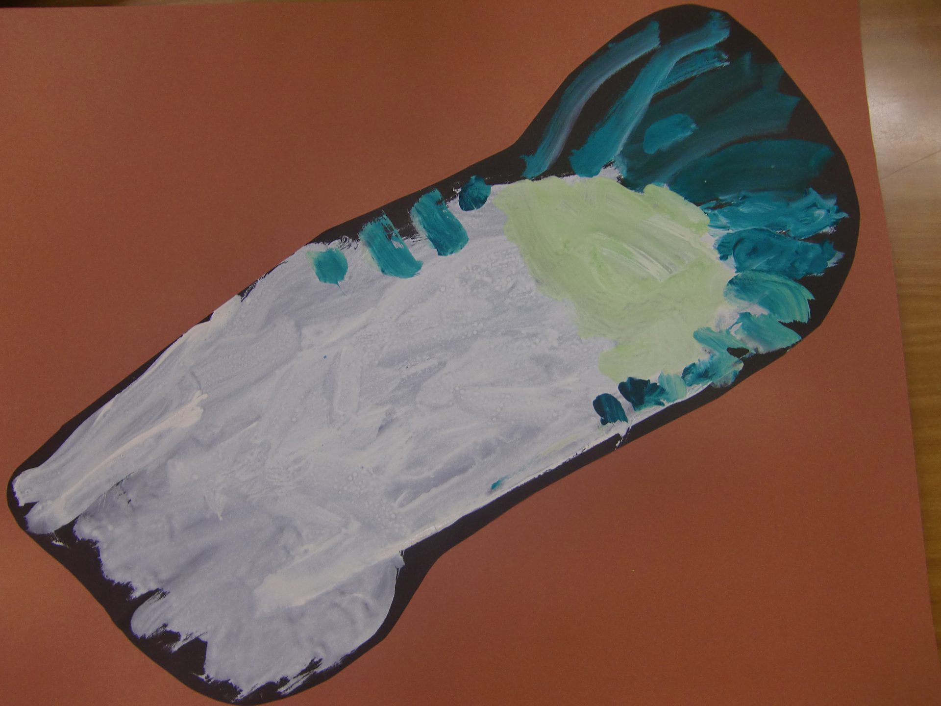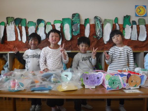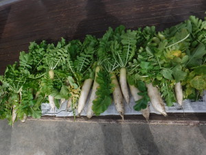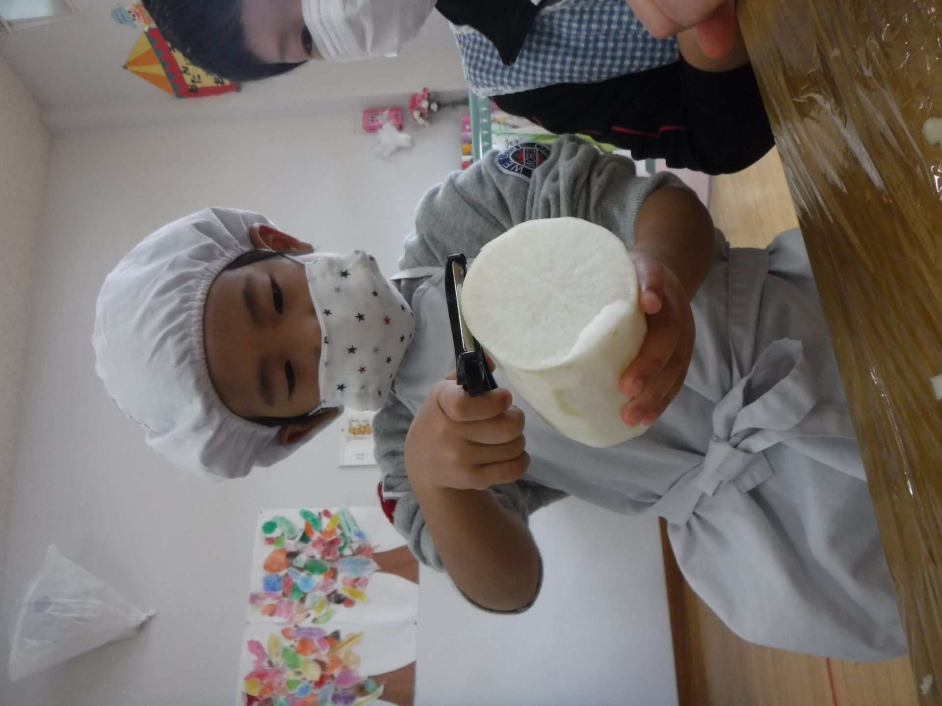 収穫した大根の絵を描きました。大根の頭の部分の色の違いに気づき、黄緑色を使う子どもも出てきました。クラス人数分の描き上がった大根は、部屋の畑に飾りました。