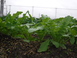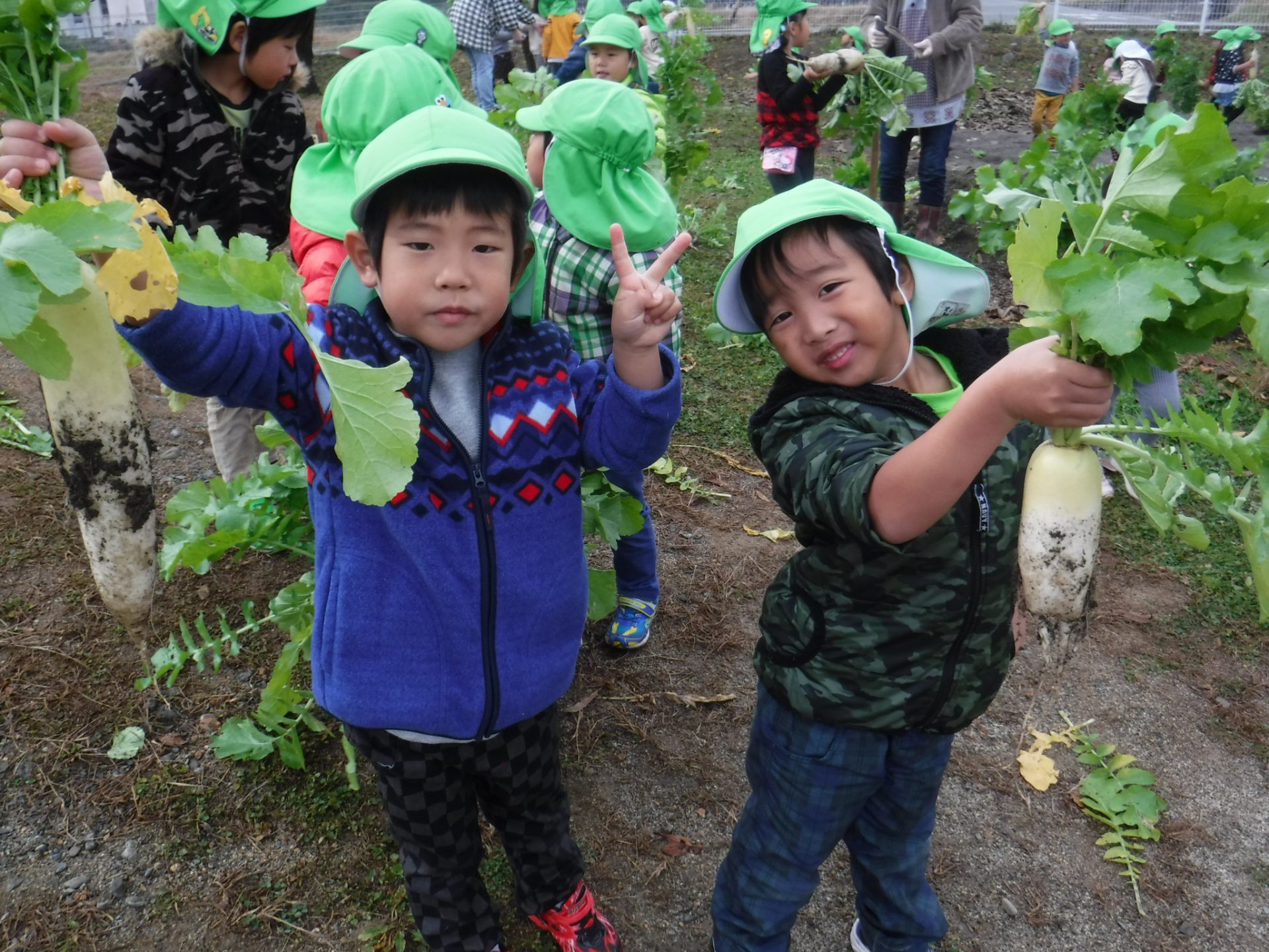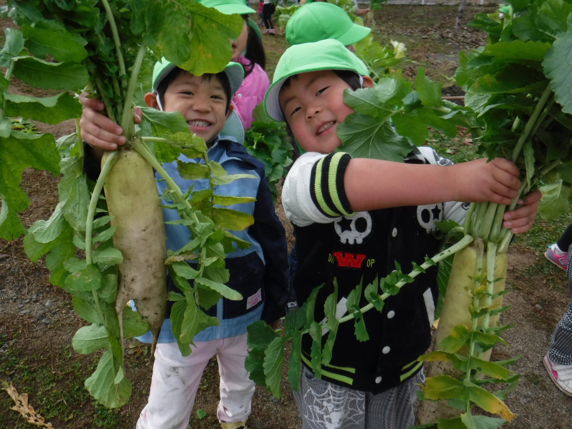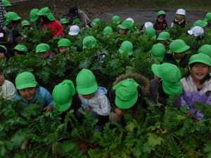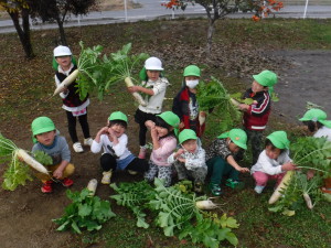 大きく育った大根の葉っぱの蔭に隠れて「かくれんぼできたね。」と遊ぶ子どももいました。11月中旬 収穫。一人一本ずつ抜きました。「毛が生えてる。ひげがある。」「大きいね。」「長いね。」「重い!」と喜んで抜き、他の学年の子どもや保育士に見せに行きました。