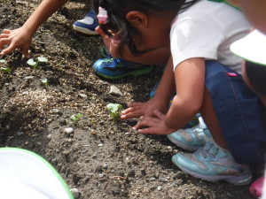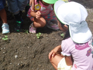 芽が出た時には、クラスの友だちに喜んで報告し、みんなで覗き込んで見ました。「葉っぱが大きくなったね。」と自分の手のひら比べてみている子どももいました。