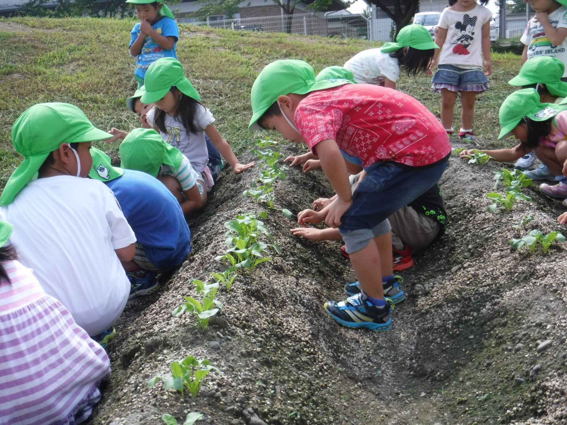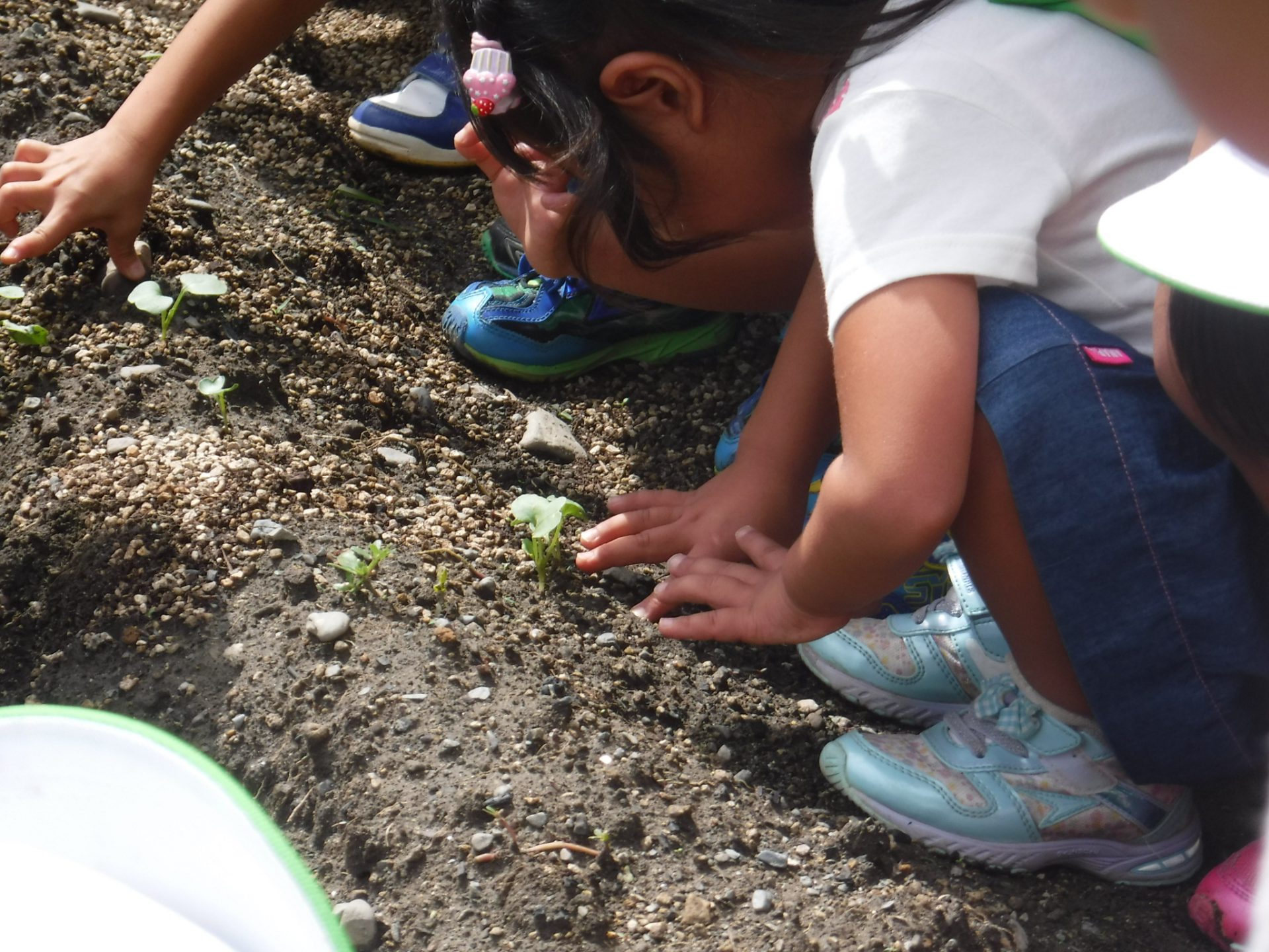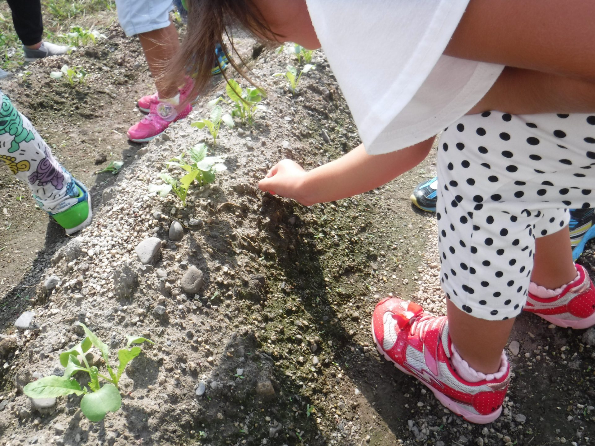 活動が断片的にならないよう、できるだけ毎日畑を見に行くことを大切に考え、大きく変化していないことも子どもの気づきとして大切にして、畑に行くことを促した。どんなことにも、気づいたこと、楽しみにすること、食へのありがとうの気持ちを大切にして声掛けをしてきた。