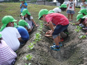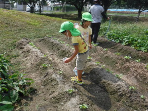 9月上旬 大根の絵を見ながら、小さな種からできることを伝えました。当番が、毎日水くれをして芽が出るのを楽しみに待ちました。