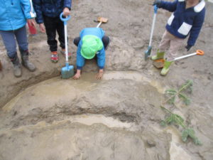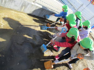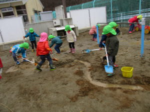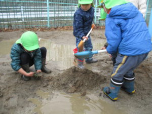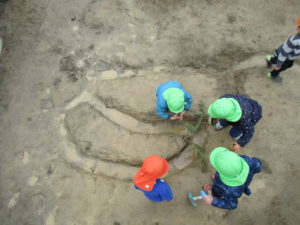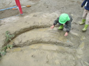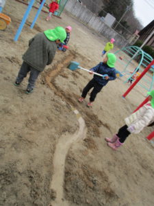川作り・ダム作りは子ドも立ち同士の会話が少なく、個々のあそび?と思いましたが、じっと観察していると友だちの姿や言葉をキャッチしながら自分の仕事をしていました。