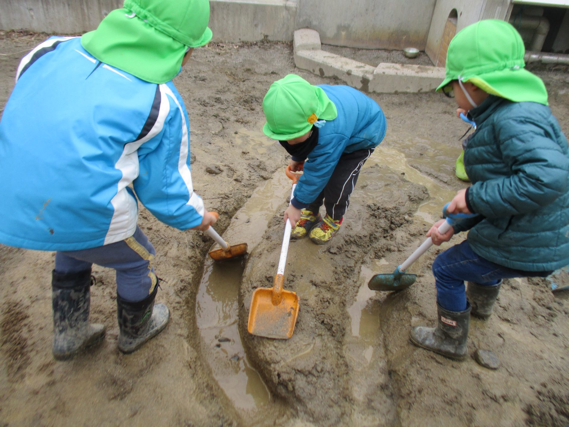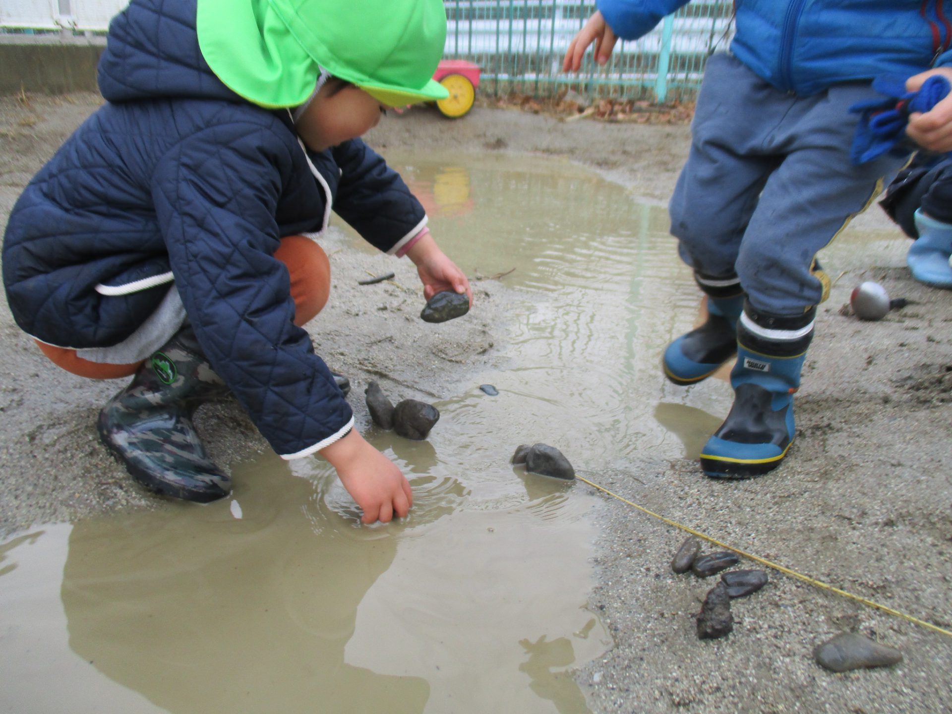 雨が降った次の日、園庭に作られた川を石でせき止め、ダム作りが始まりました。