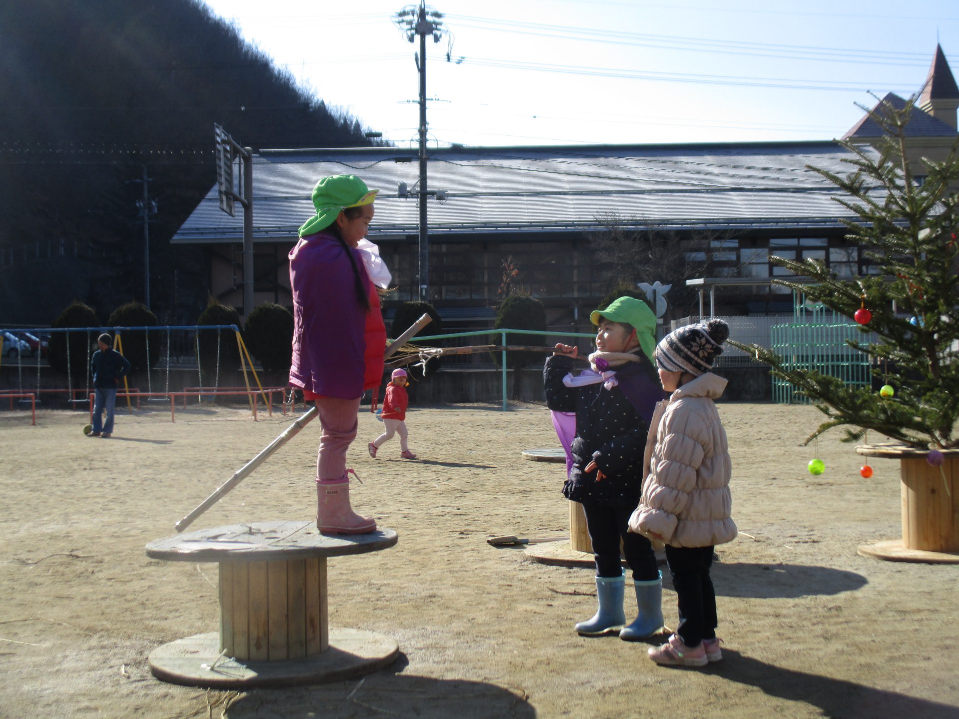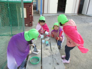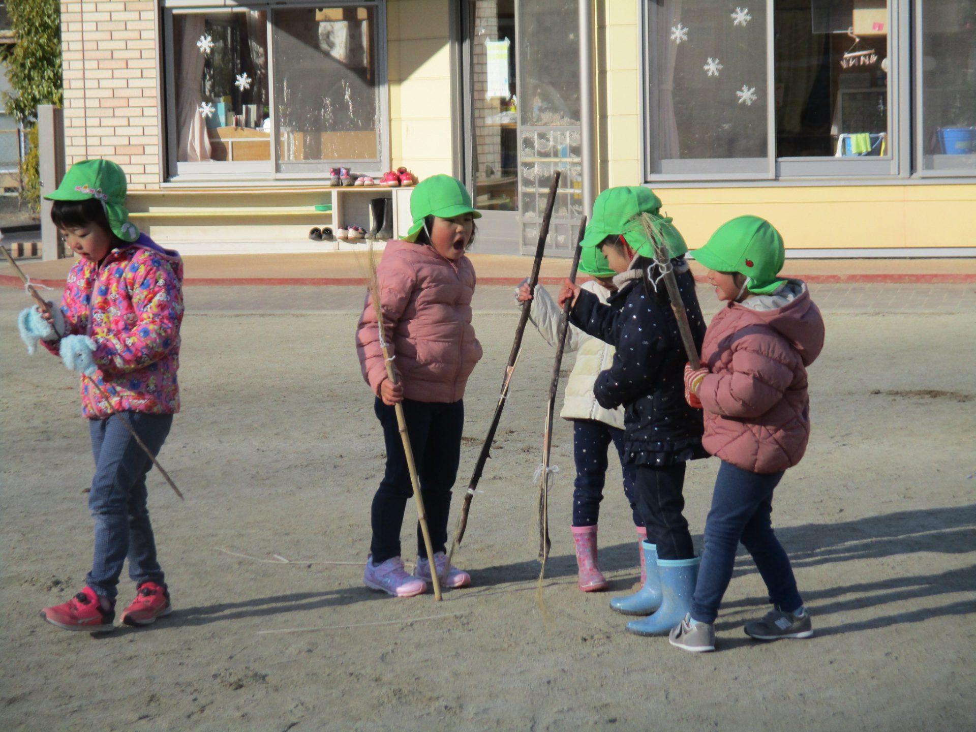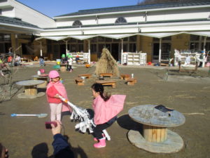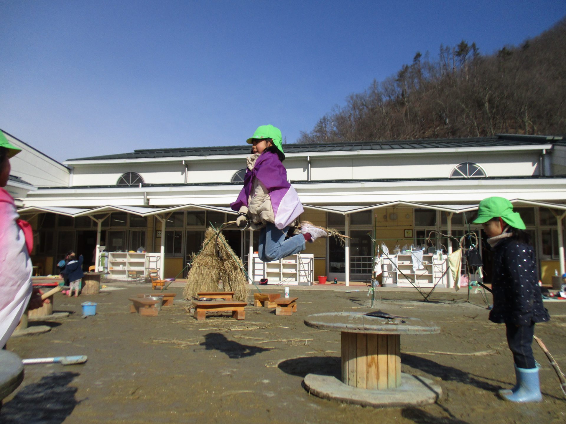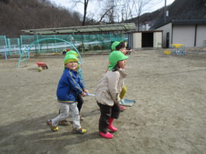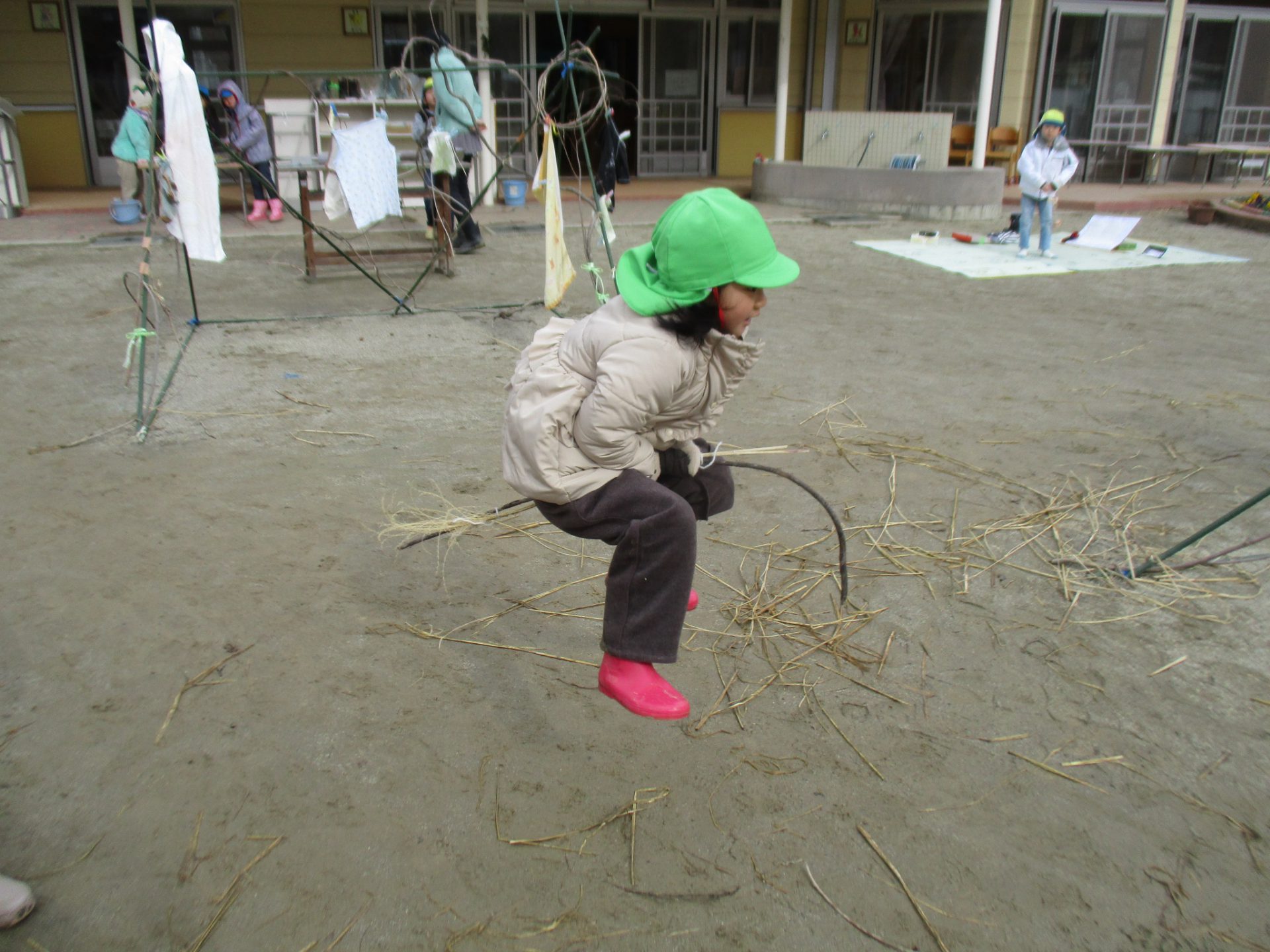 この日はシャベルをほうき変わりにまじょごっこが始まりました。
