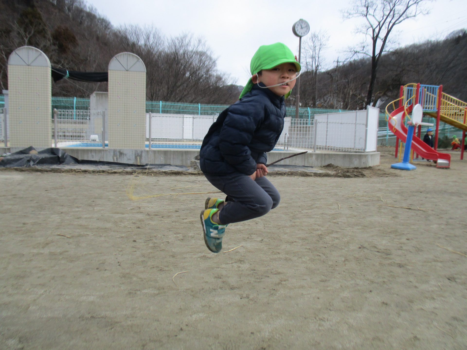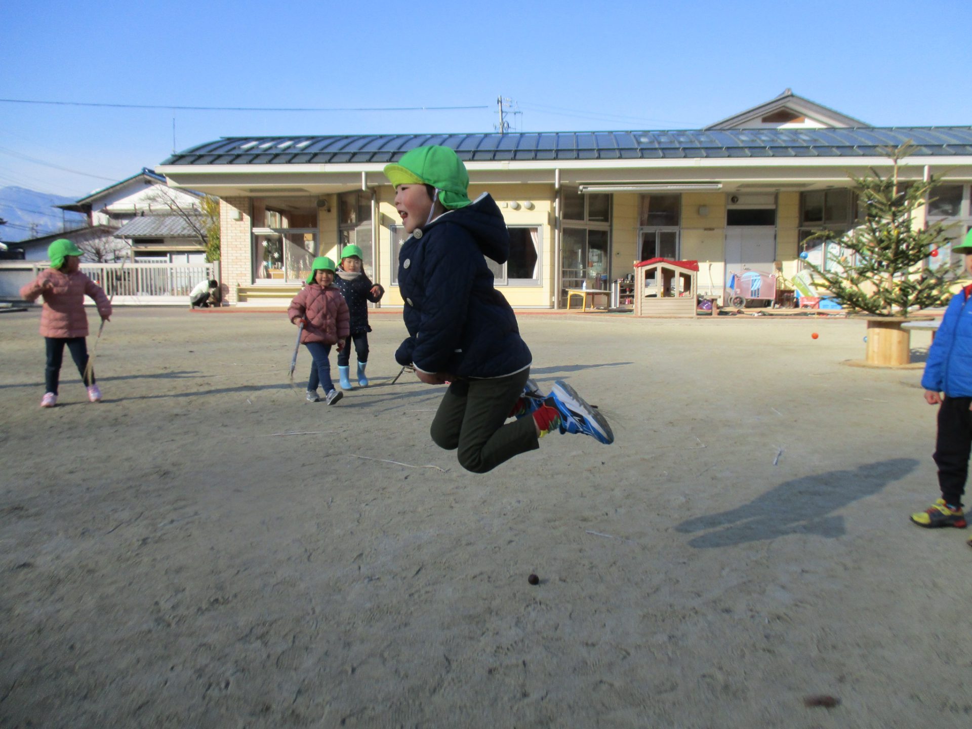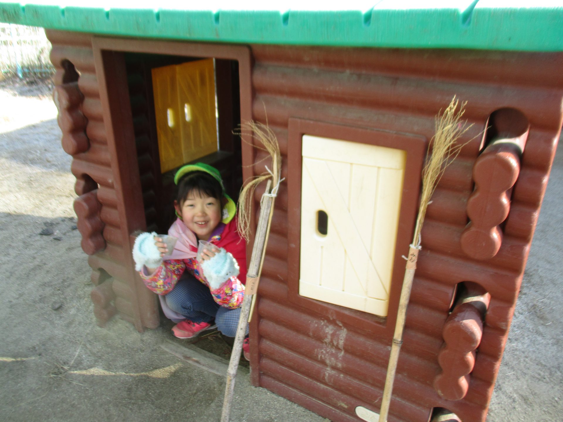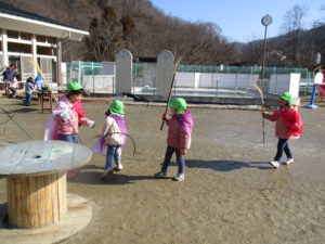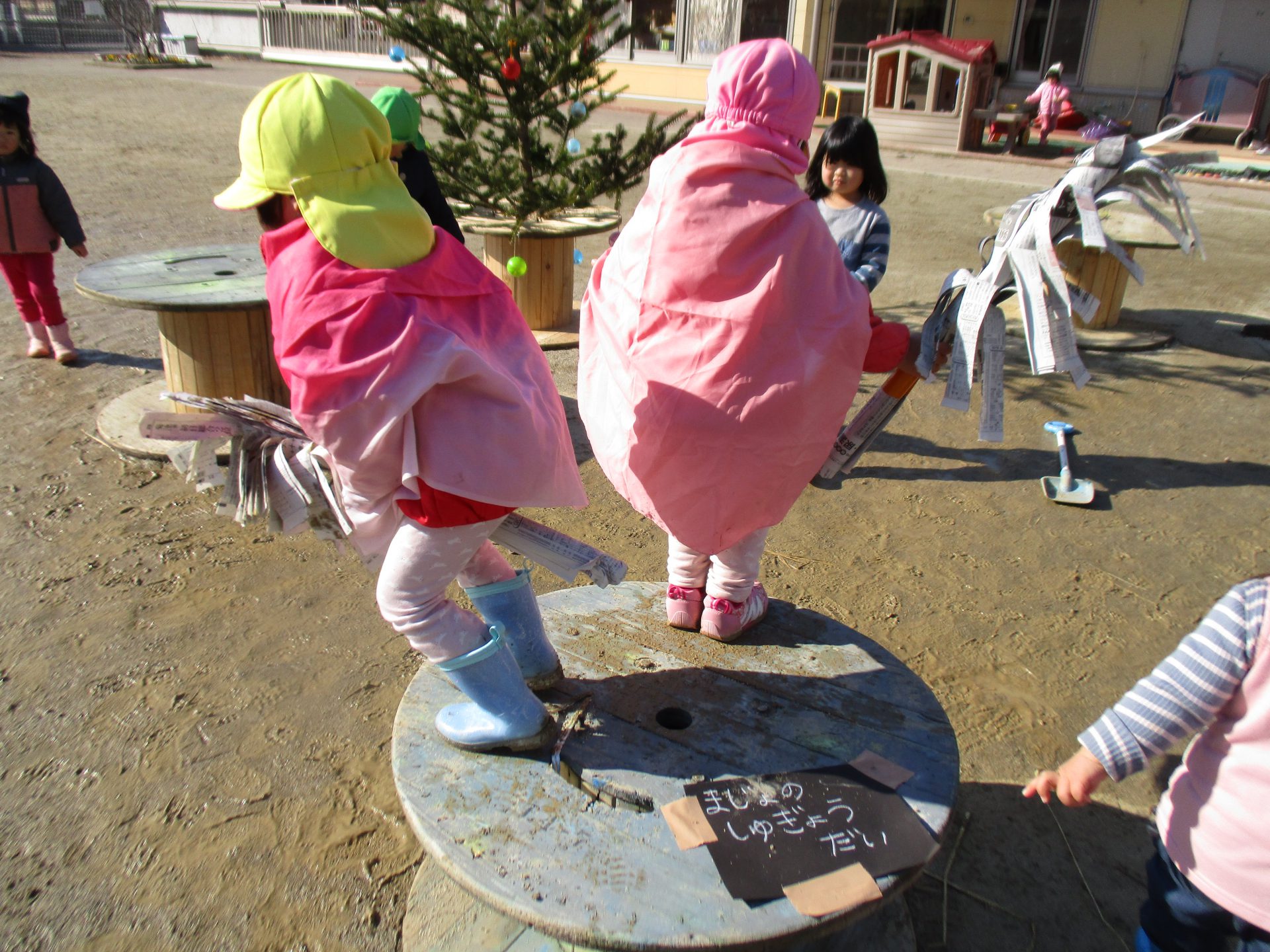 この日はシャベルをほうき変わりにまじょごっこが始まりました。