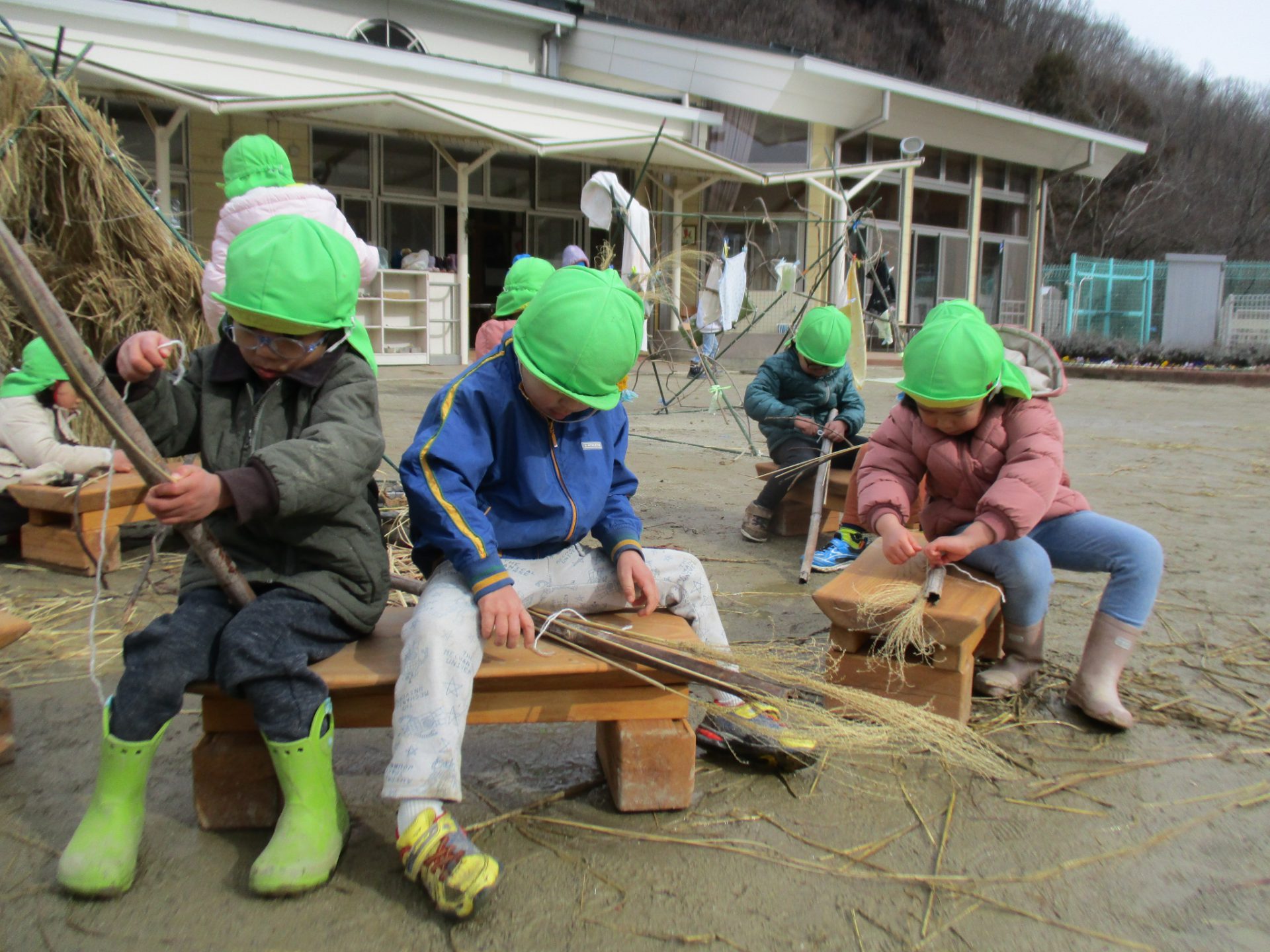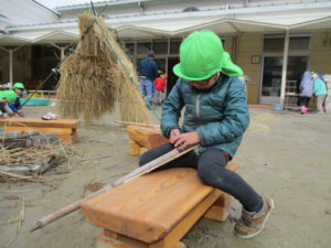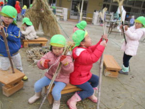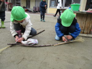 と保育士が言うとみんなチャレンジ。“ほうきをつくる”ことへの意欲がいっぱいで