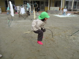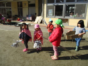 ほうき作りでは「やって」「できない」と言うことばもありましたが、保育士の声かけでやってみよとする姿、根気よく取り組む姿が見られ、結び方やとめ方には一人ひとりの真剣さや頑張りが見られ、みんなが「できた!」と達成感を味わいその後も大事なほうきを持って、まじょごっこが何日も続きました。この遊びにみんなが同じ楽しみを持ち続け友だちの中で楽しく走る姿からも、子どもたちのあそびやチャレンジする姿を見守り続けてきた担任も嬉しく思いました。