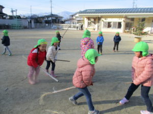 「おはよう」と登園してくると、すぐまじょのほうきを持って園庭へ。