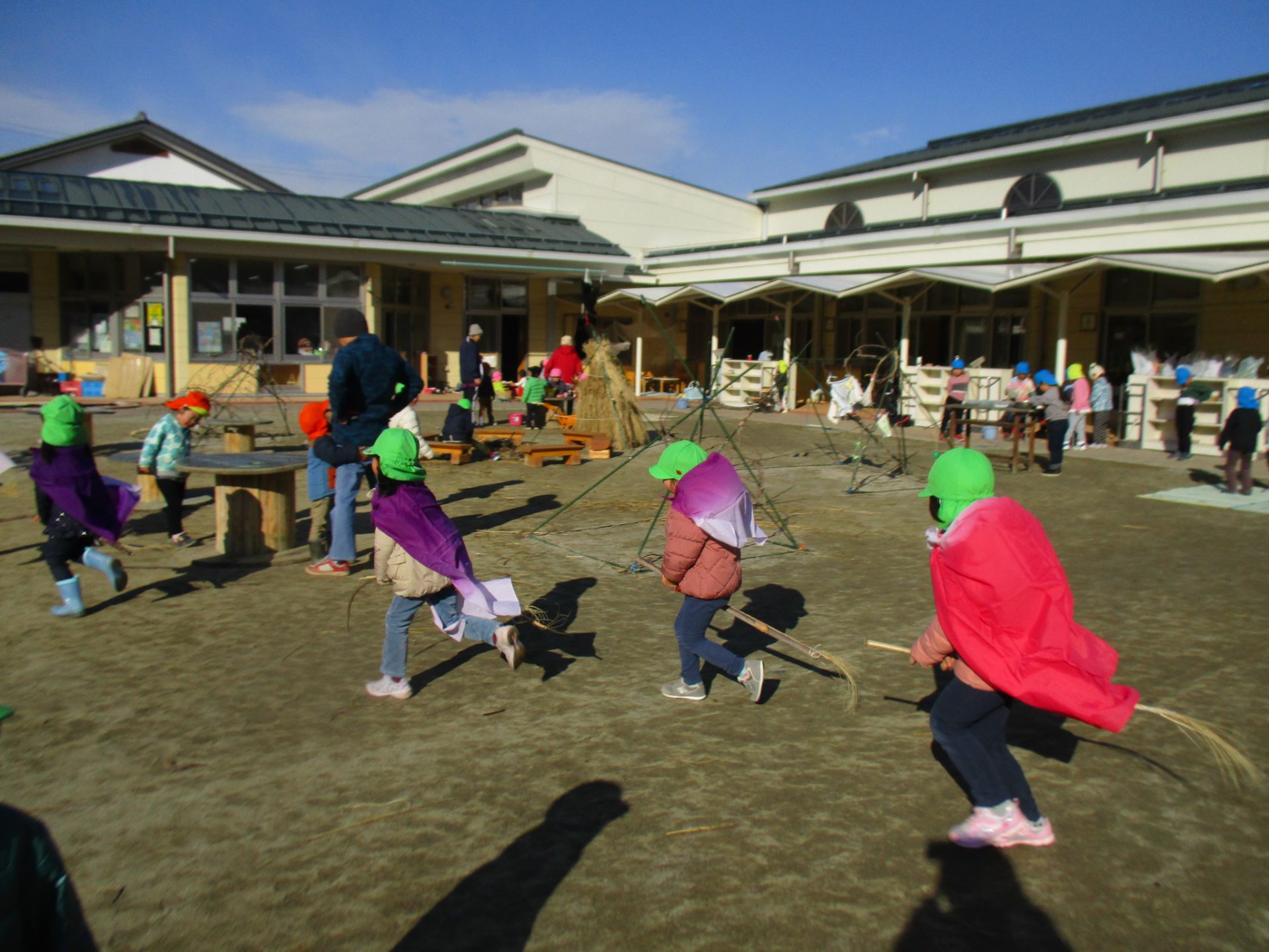ほうきに乗ってまじょたちは園庭を楽しそうに走りまわっています。