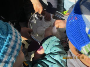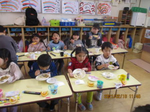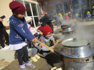 訓練もしっかりできて、お腹が空いた子ども達。自分達で炊いたごはんで給食を食べます。