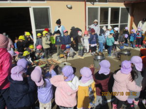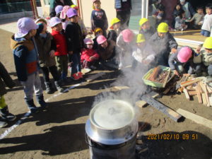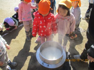 年長児は薪をくべて火加減を調整することを感じます。うちわであおいで楽しむ子もいます。じっと火をみつめる子もいます。シューっという音に耳を傾ける小さな子もいます。