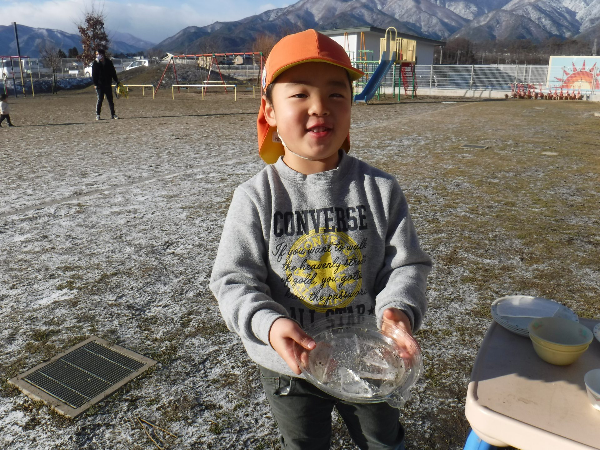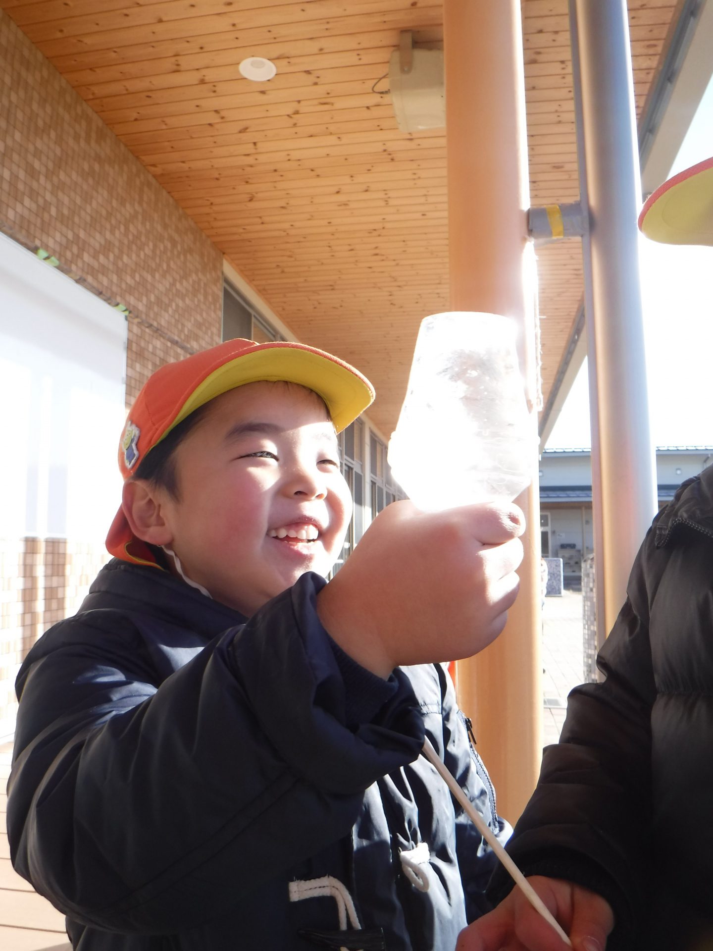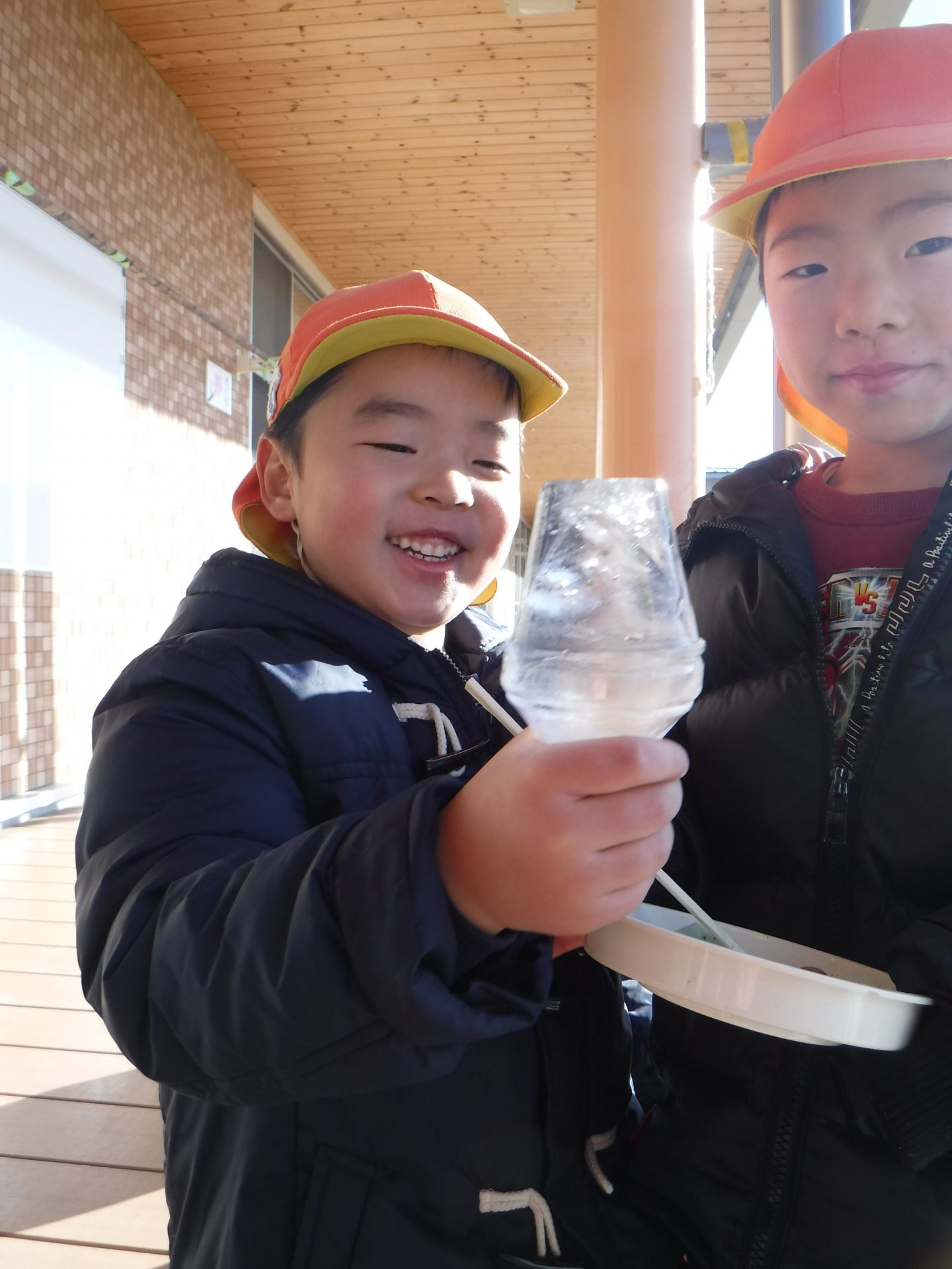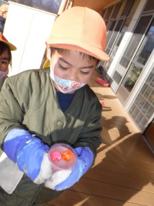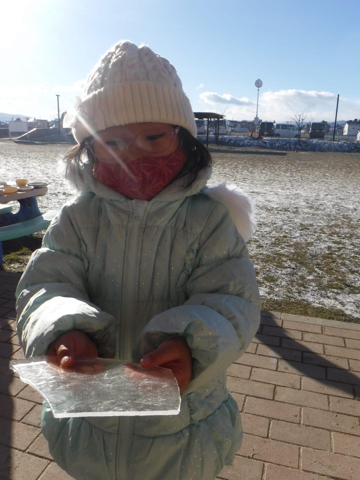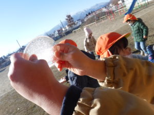 寒さの続く冬の朝、外で遊んでいる子が氷を探してもってきました。