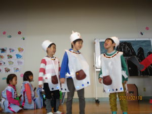 発表に向け、自分のやりたい役を選び、練習を重ねてきました。動きを自分たちで考えたり、道具を一緒に作る中で、当日の発表をより楽しみにしている姿がありました。