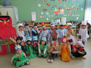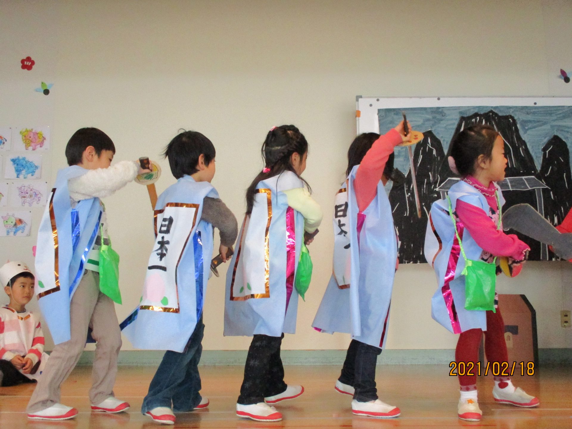 各クラス、劇や合奏、生活発表を行いました。年中ゆり組では、劇「ももたろう」を行いました。自分のやりたい役を選び、毎日練習を行ってきました。お家の方に発表を見ていただき、子どもたちはのびのびと役になりきって、セリフを言う姿が見られました。終了後は緊張がほぐれ、温かい日差しの下で遊びを楽しんでいました。