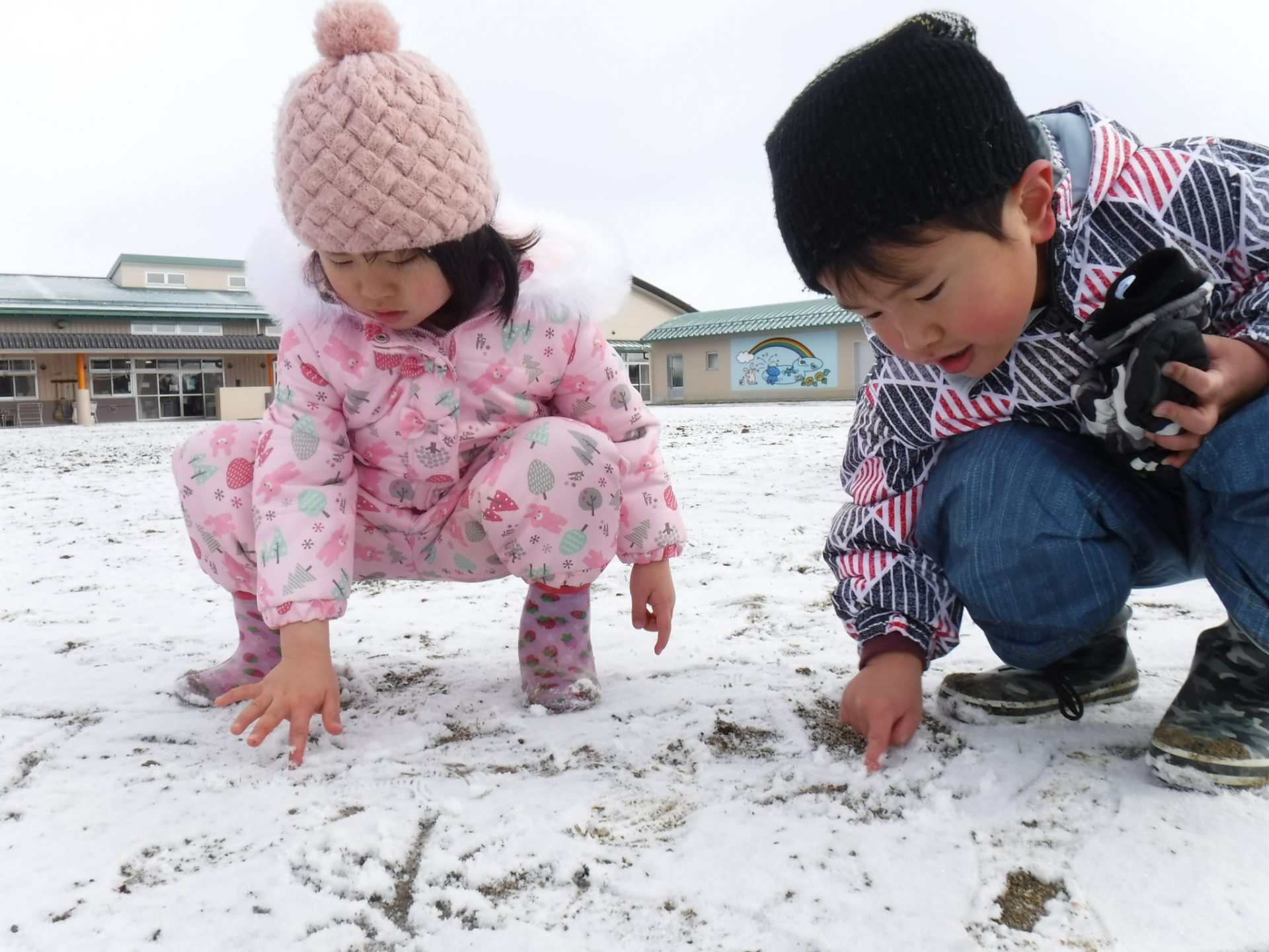 園庭が白くなっているのを見て遊ぶ子どもたち。