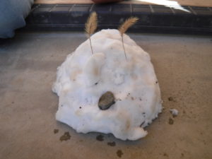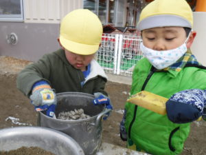 薄っすら積もった雪をかき集めて、何を作っているのかな・・・