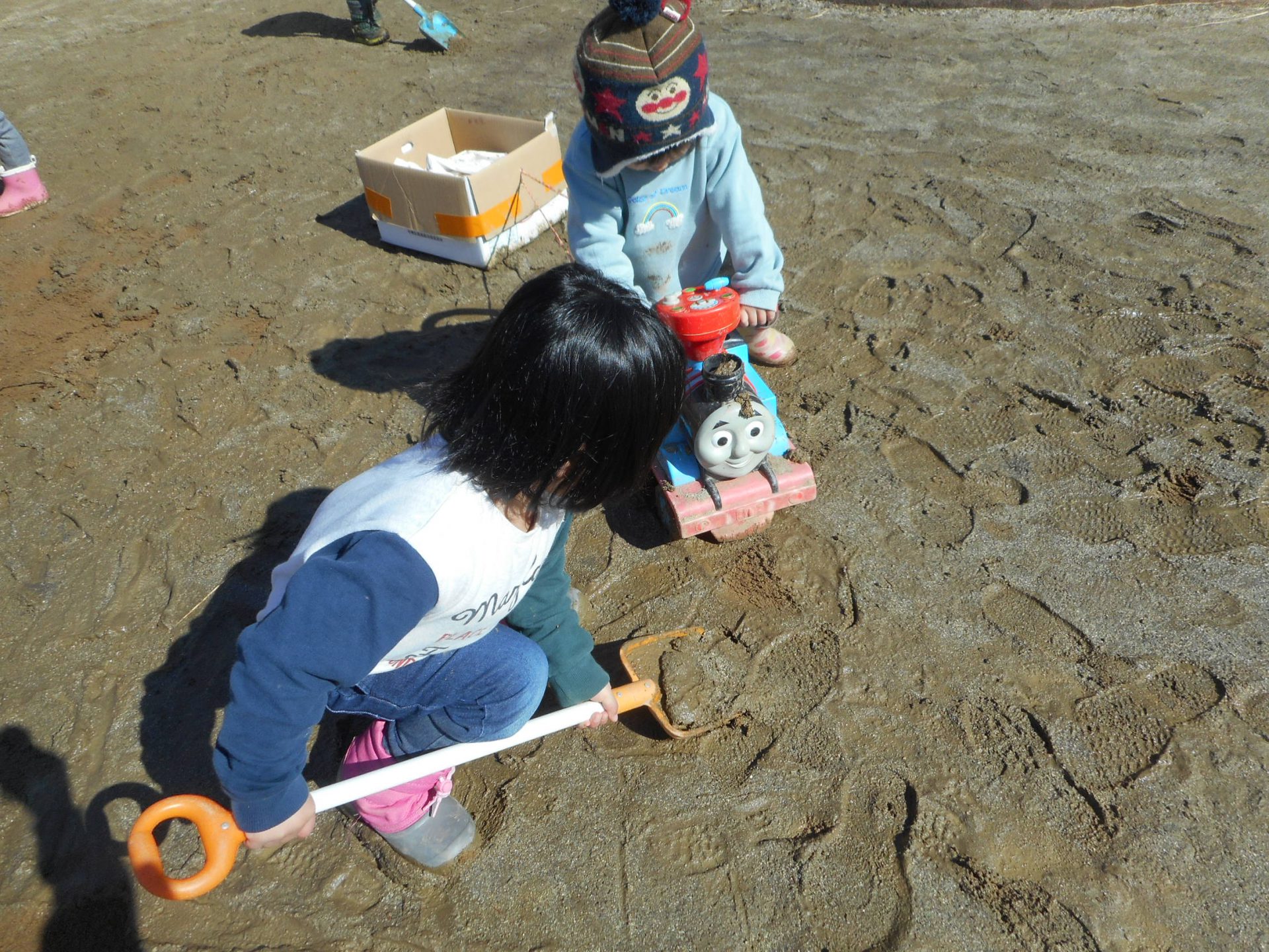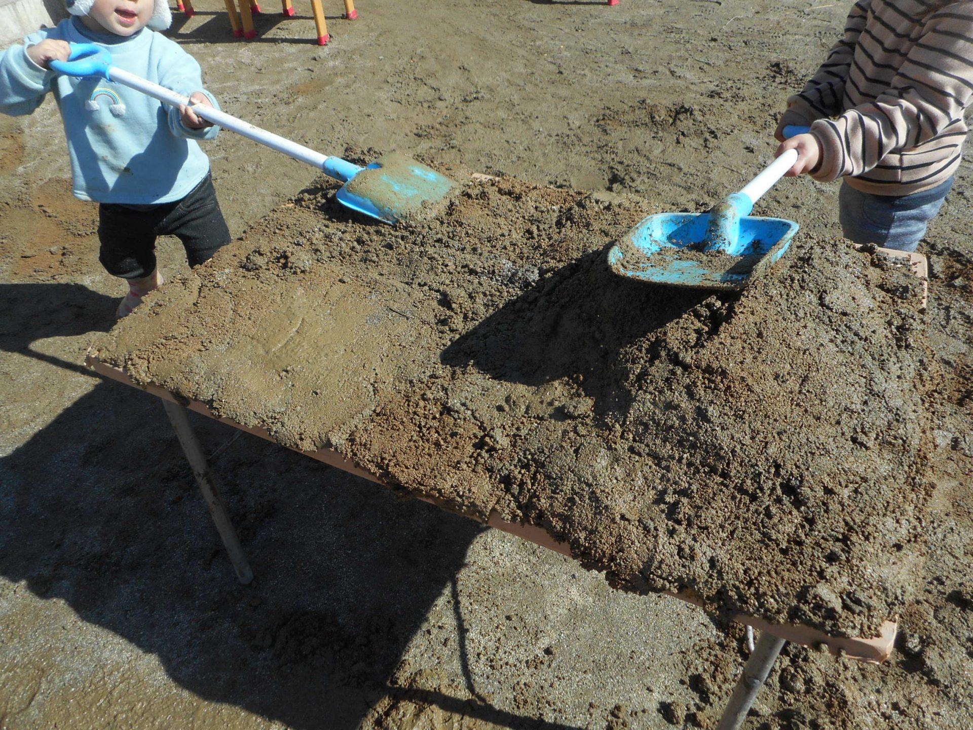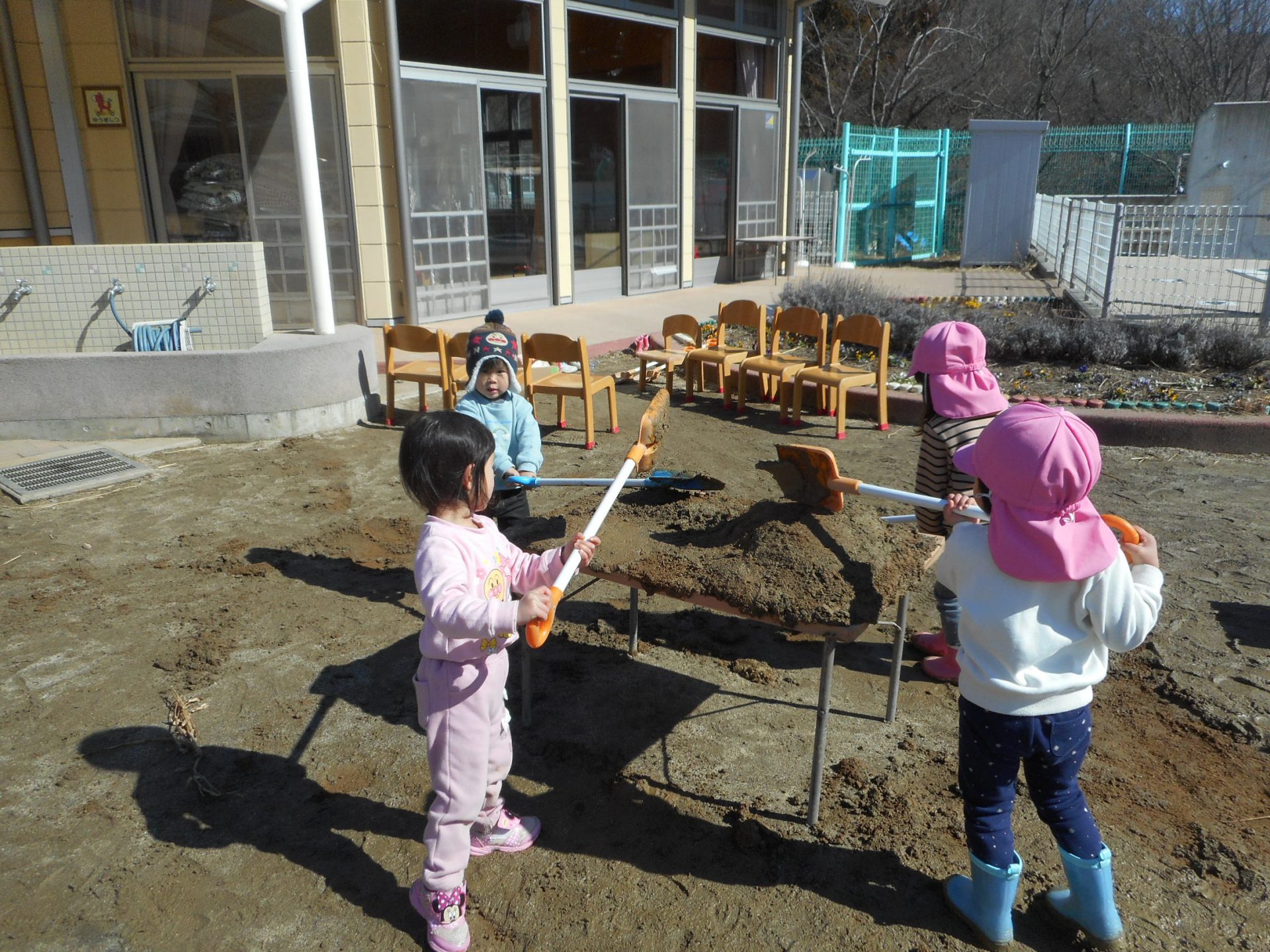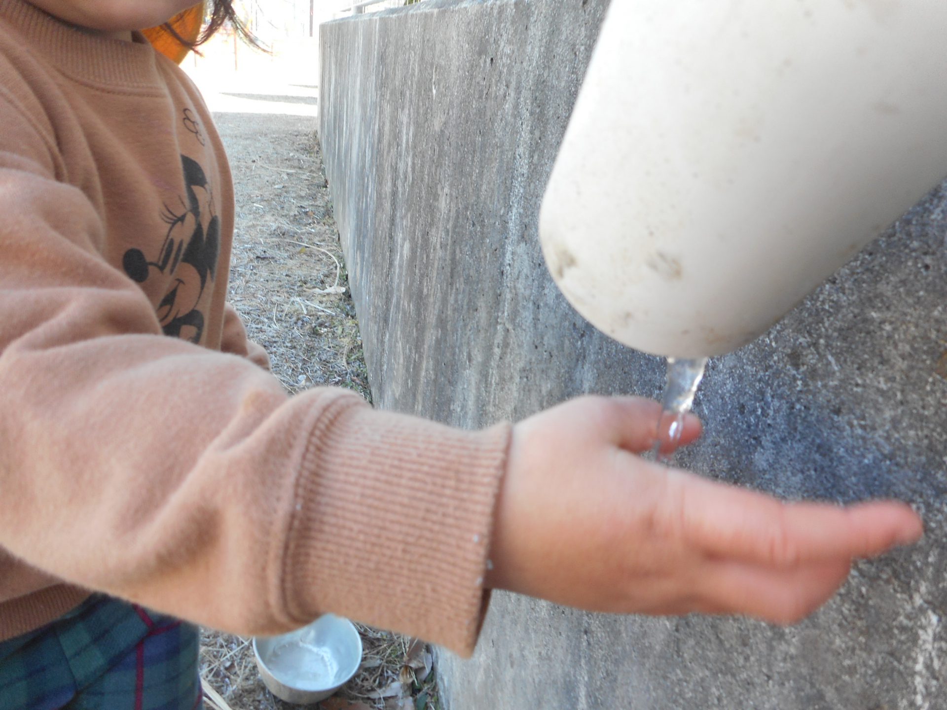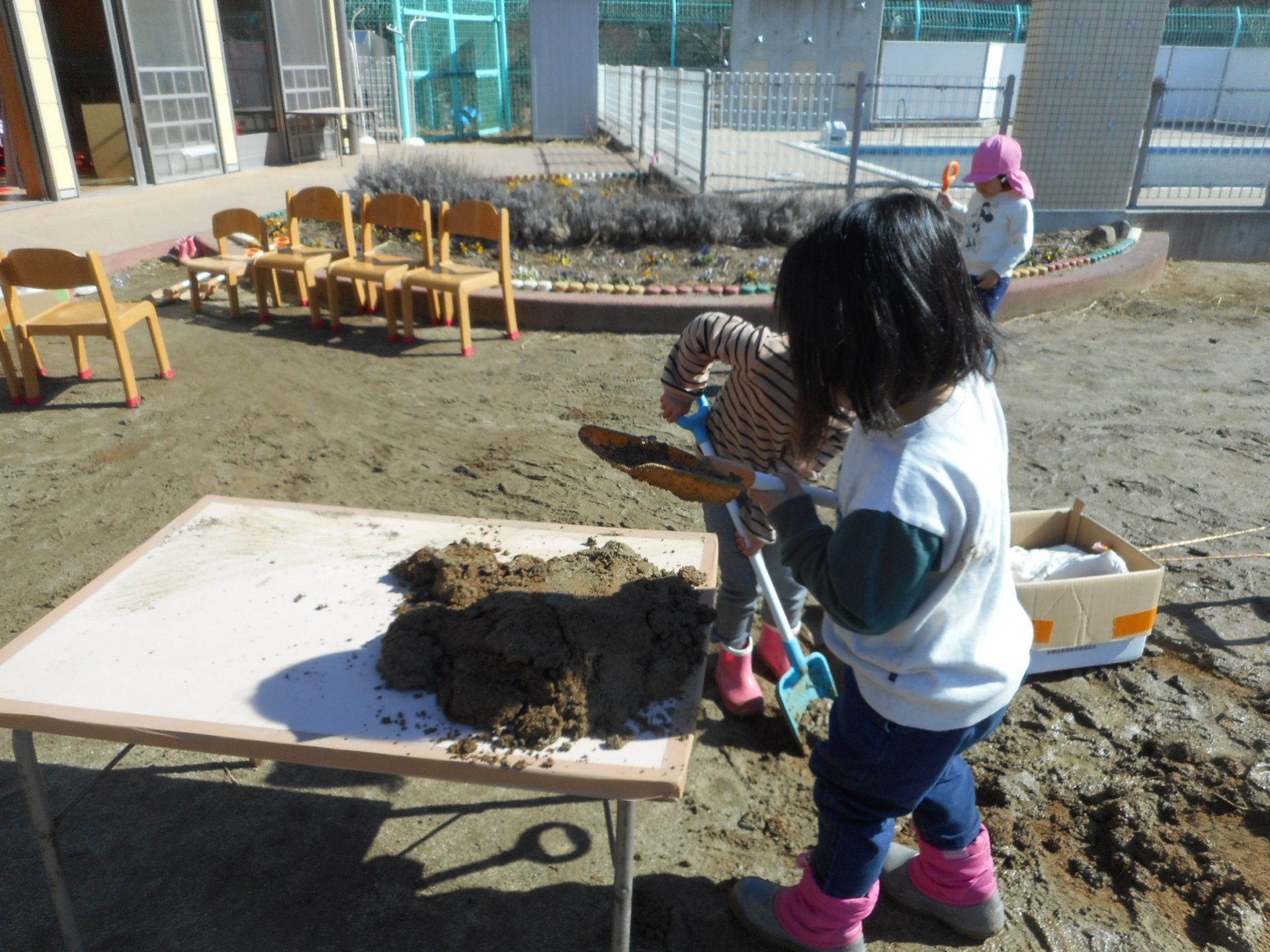 登園時にあった霜が溶け、園庭中が泥んこ。