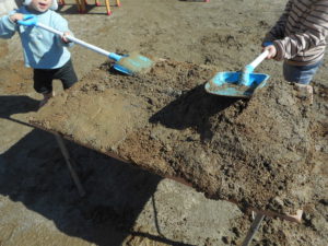 重い土を持ち上げることに夢中になっている2歳児。この一生懸命な姿は、まるで職人さんのように丁寧に持ち上げ、真剣な表情です。
