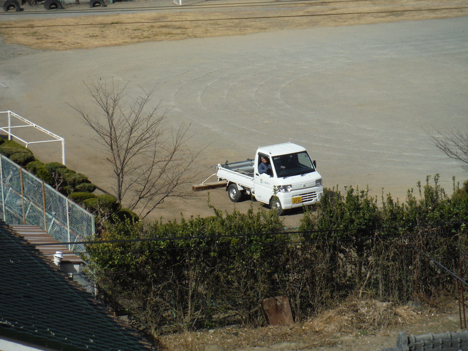 たかいところから小学校をみていると校庭に軽トラが・・・