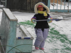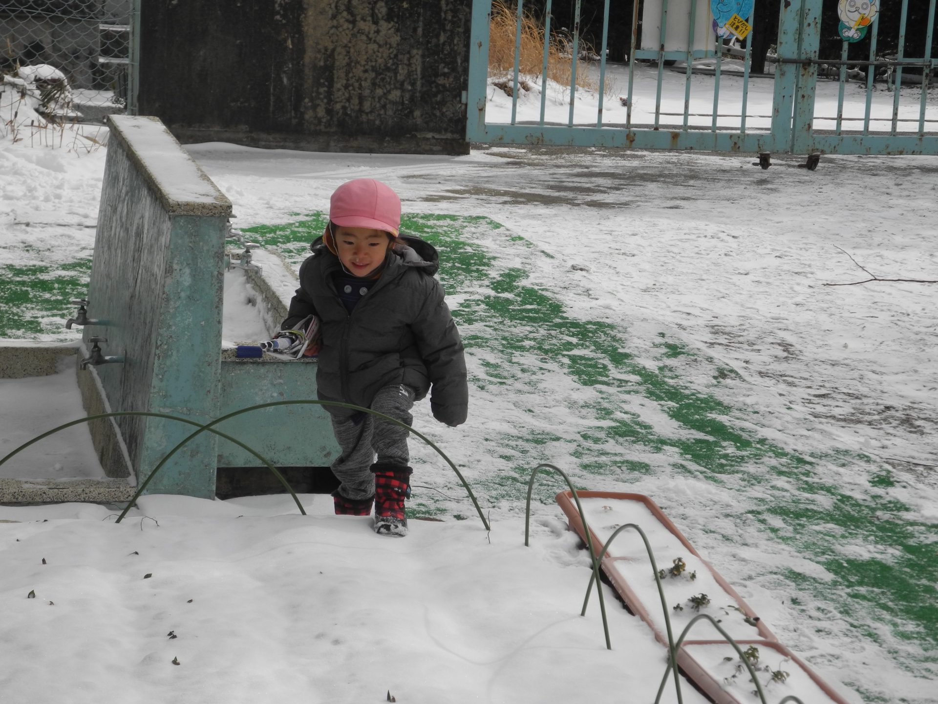 手洗い場に積もったきれいな雪をきれいなまま遊びたいという一人の子の