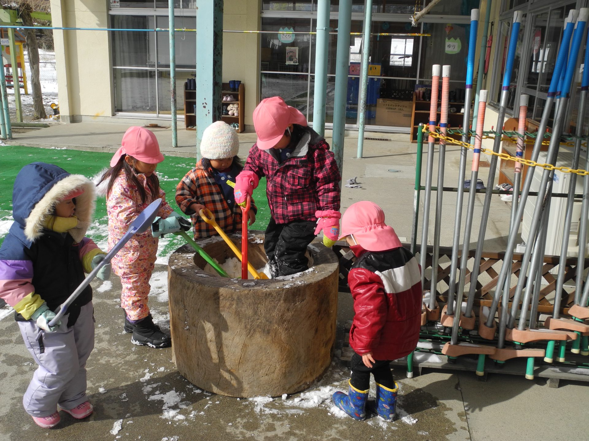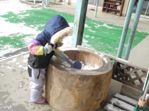 臼に気づき一人でもくもくと遊んでいるところへきれいな雪の発見に他の子たちが