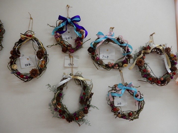 「○○さんのリース、すてきだね」「○○さんのリースもいっぱい付いててすごくいいね!」