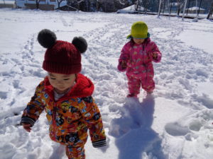 未満児のお友だちは、まっさらな雪の上に「よいしょ」と歩き回って足跡をつけていました。