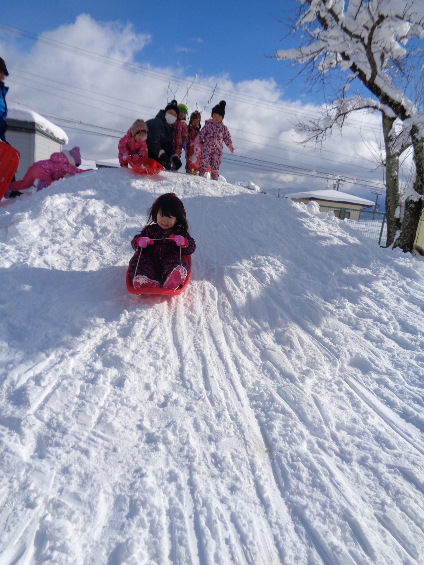 また、以上児のお兄さんお姉さん達みたいに、園庭の築山からソリで滑りました。