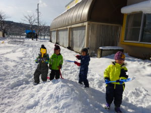 お家の方や保育者が雪かきしているのを見ている子ども達は、「自分たちも!」と雪かきをすることも…