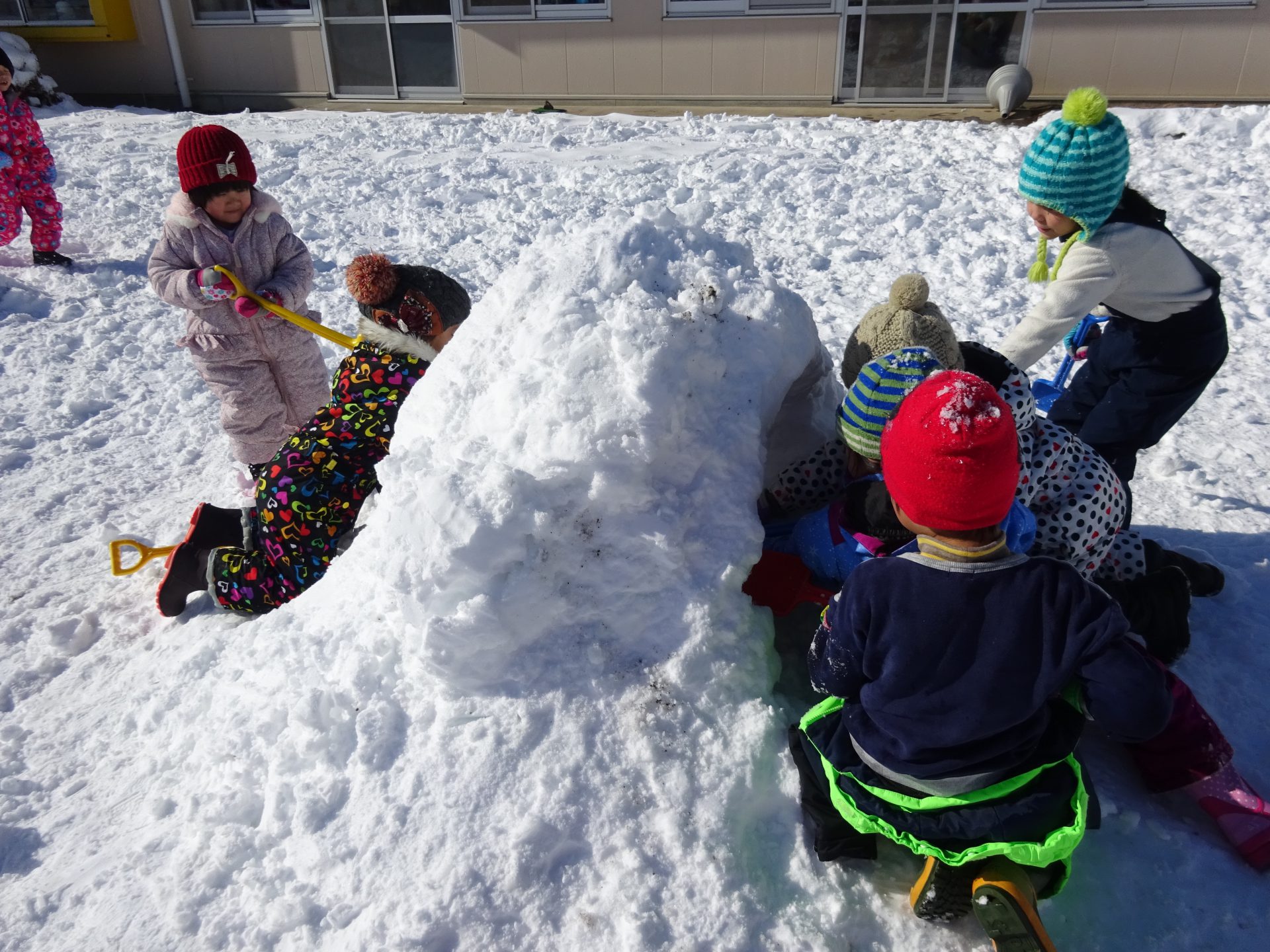 また、かまくら作りや小さな雪山づくりなどでは、子ども達の中でアイデアが出ている姿が見られました。