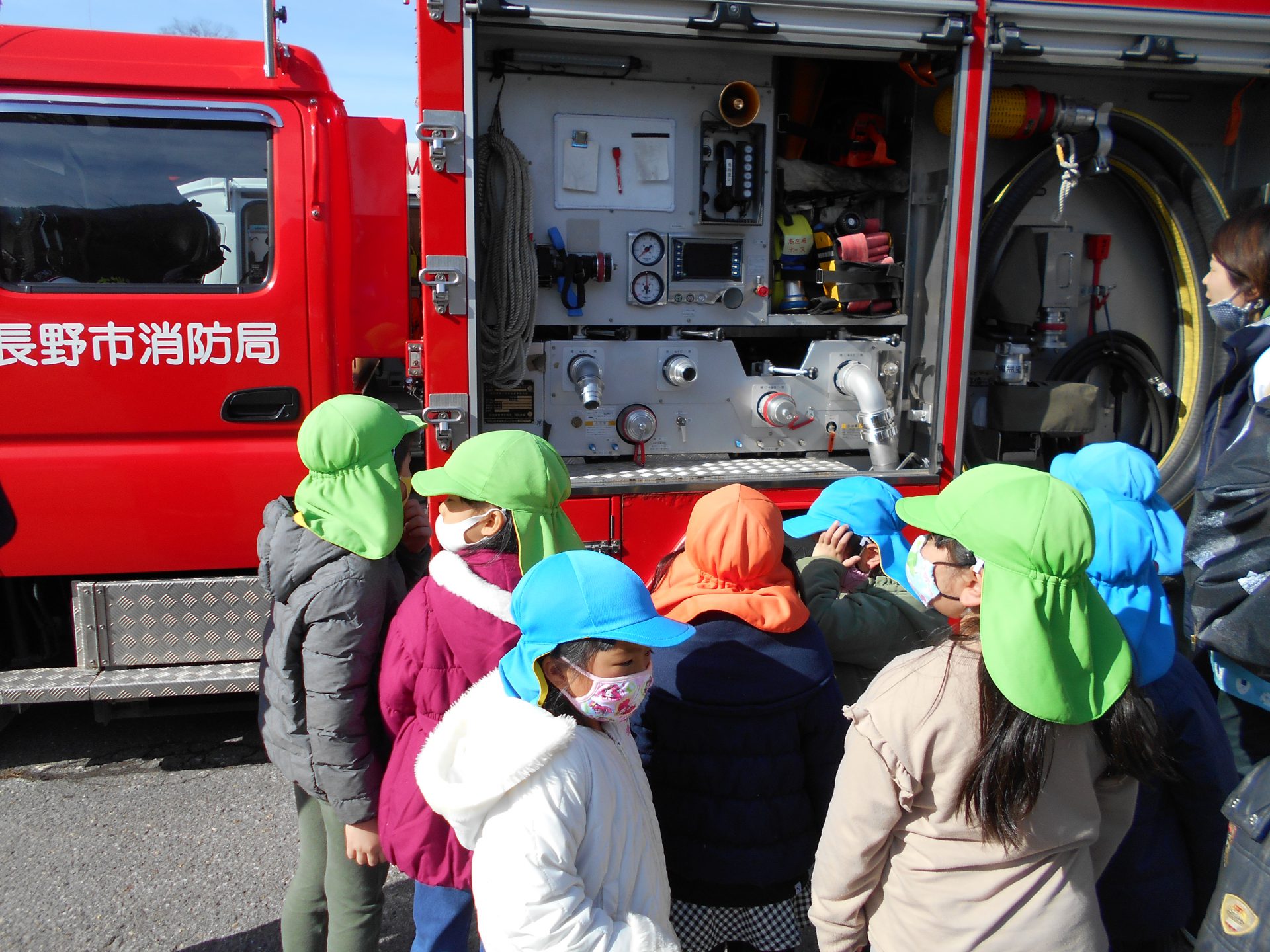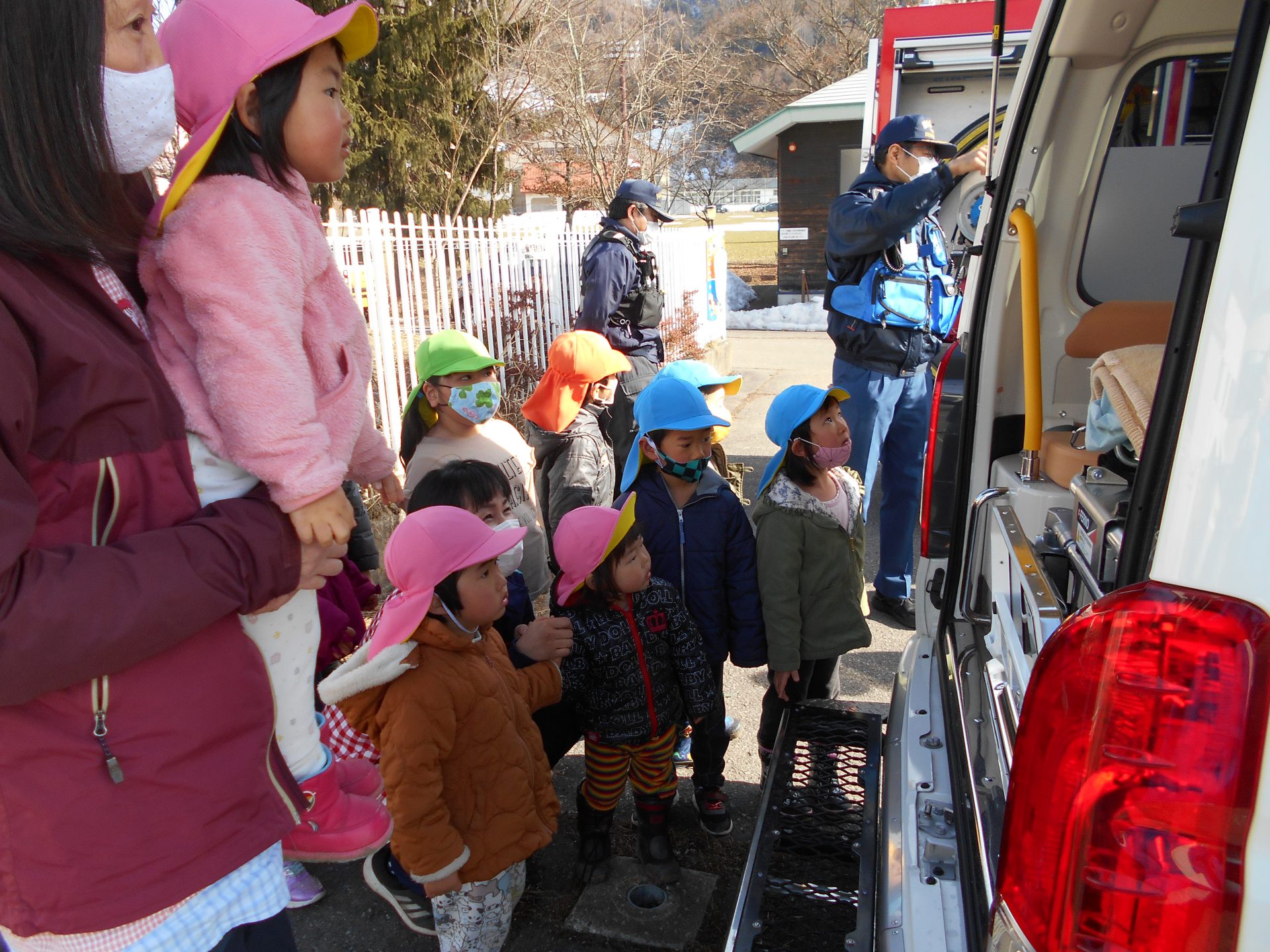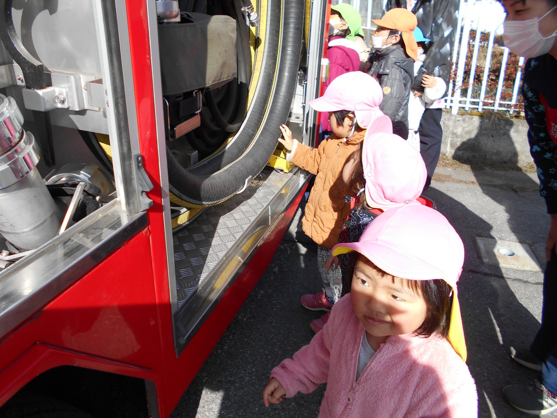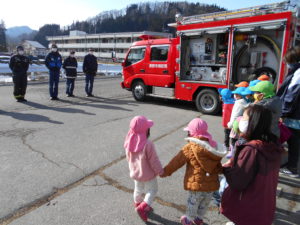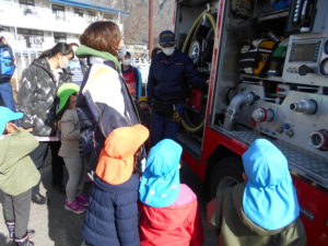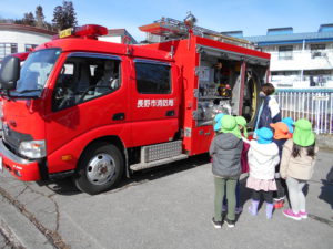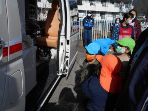 いつもは遠くからしか見られない消防車や救急車を、近くで見ることができた子どもたちは大喜び。その日の帰りは玄関に張り出された写真をお母さんたちと見ながら、消防車の話を嬉しそうにしていました。