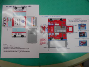 後日、消防士さん特製のペーパークラフトをいただきました(な、なんと、きなさほいくえん仕様です!)