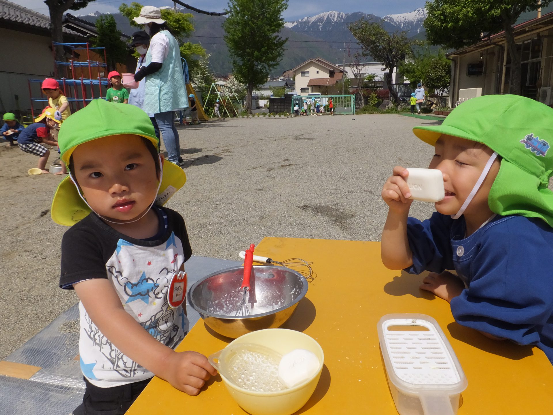 こぼれてしまった泡(水!?)を触っているうちに泥遊びに