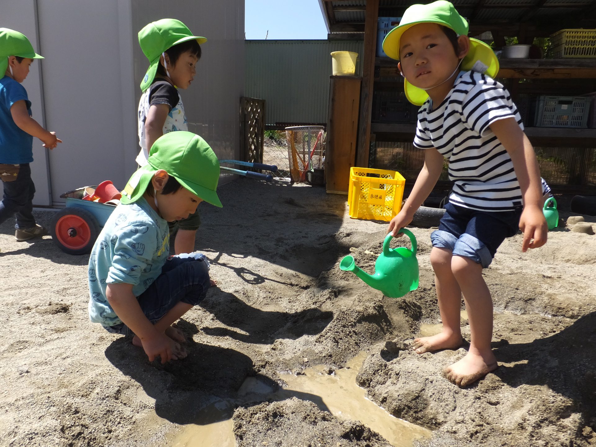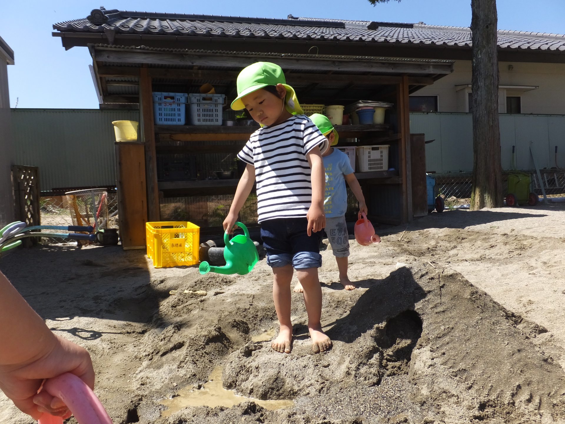 水が溜まるにつれ「池ができた」「こっちに流そう」と遊びが盛り上がりました。