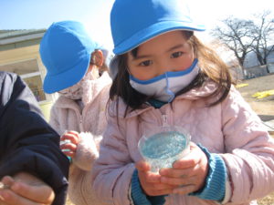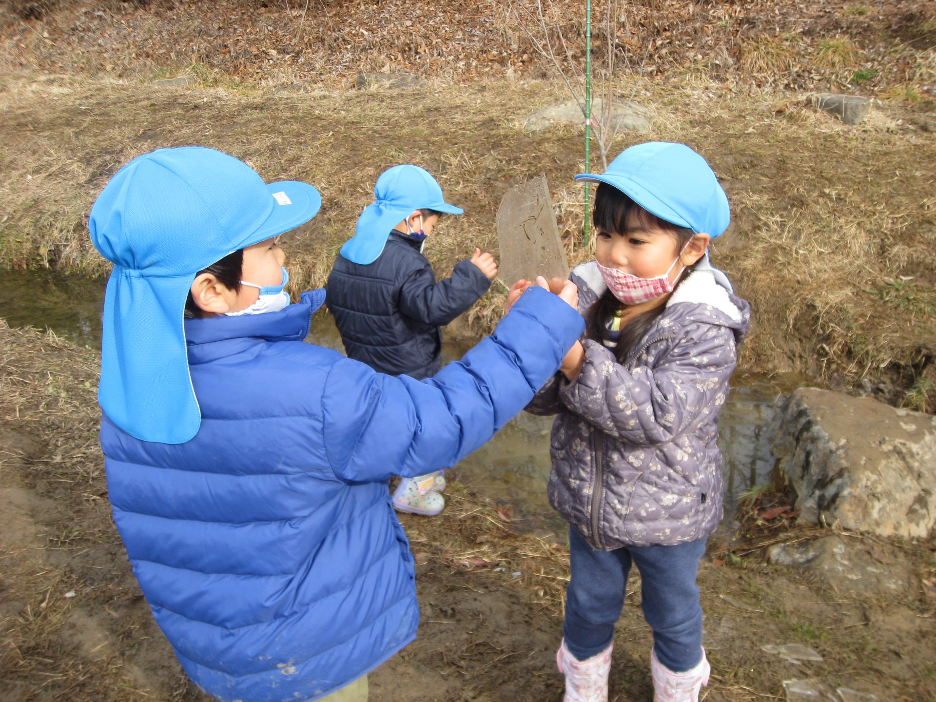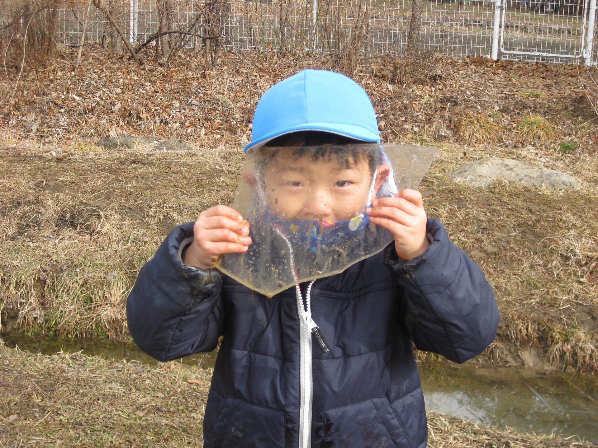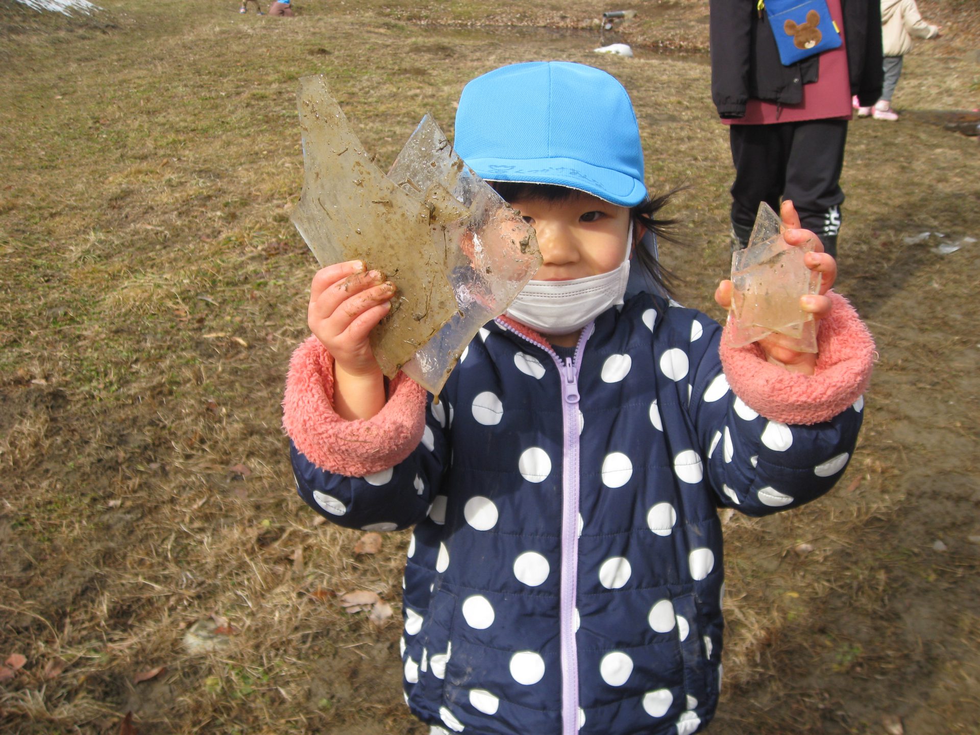 お友だちと一緒に「こんなに大きい!!」と分厚い氷を発見し大喜びでした。