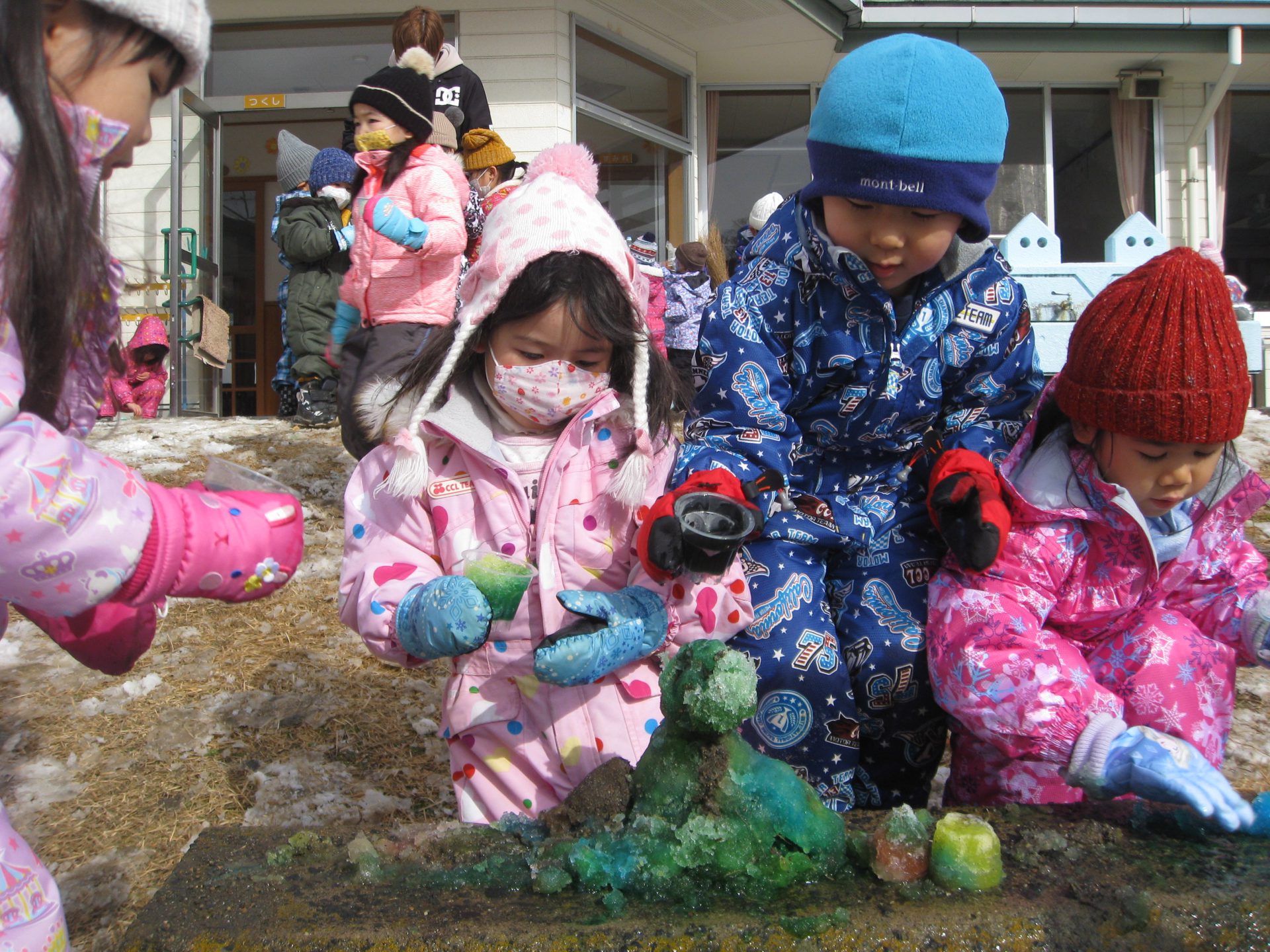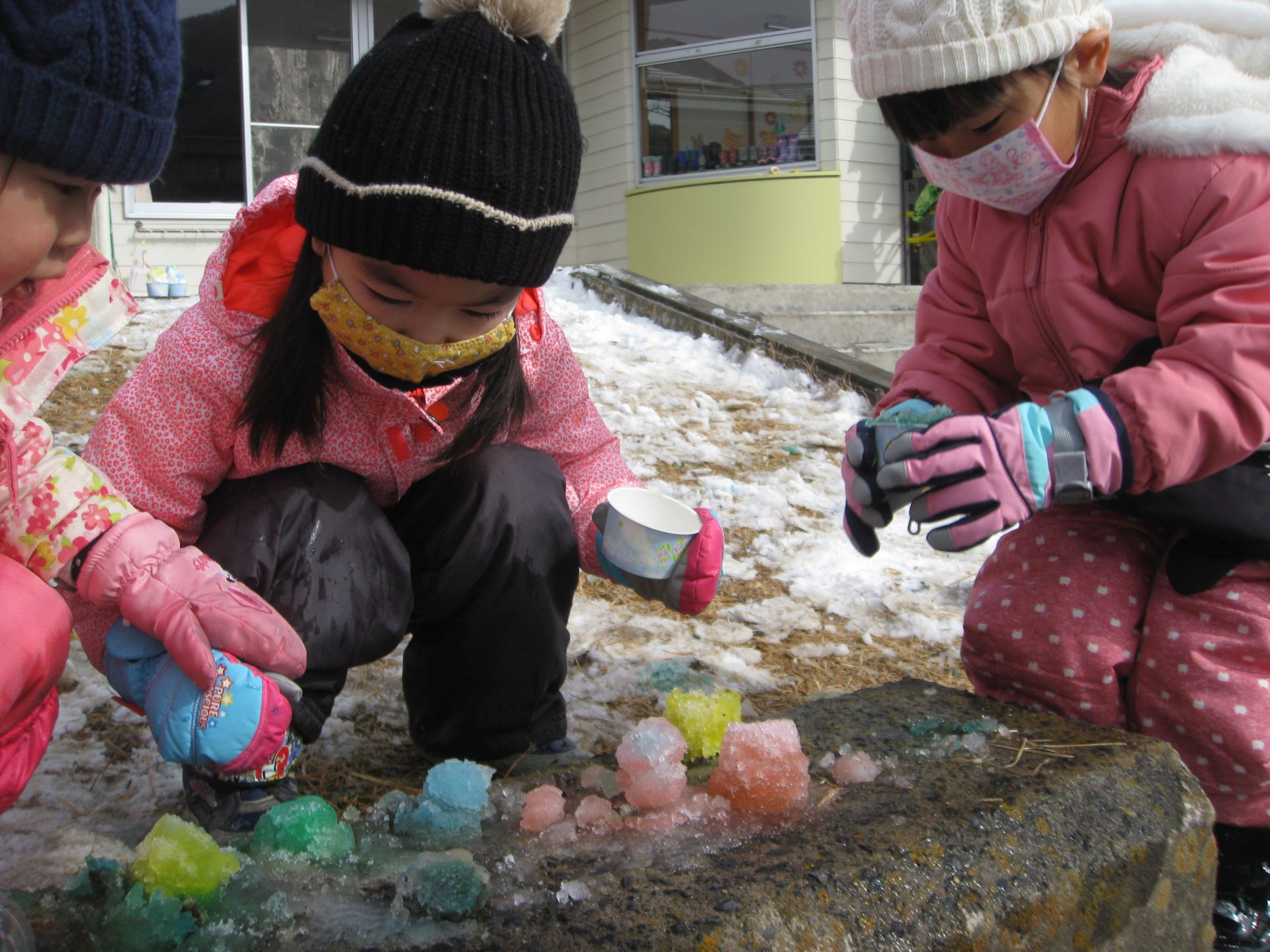 沢山並べて「きれいだね」「いろんな色の雪だよ」と楽しんでいた子も。